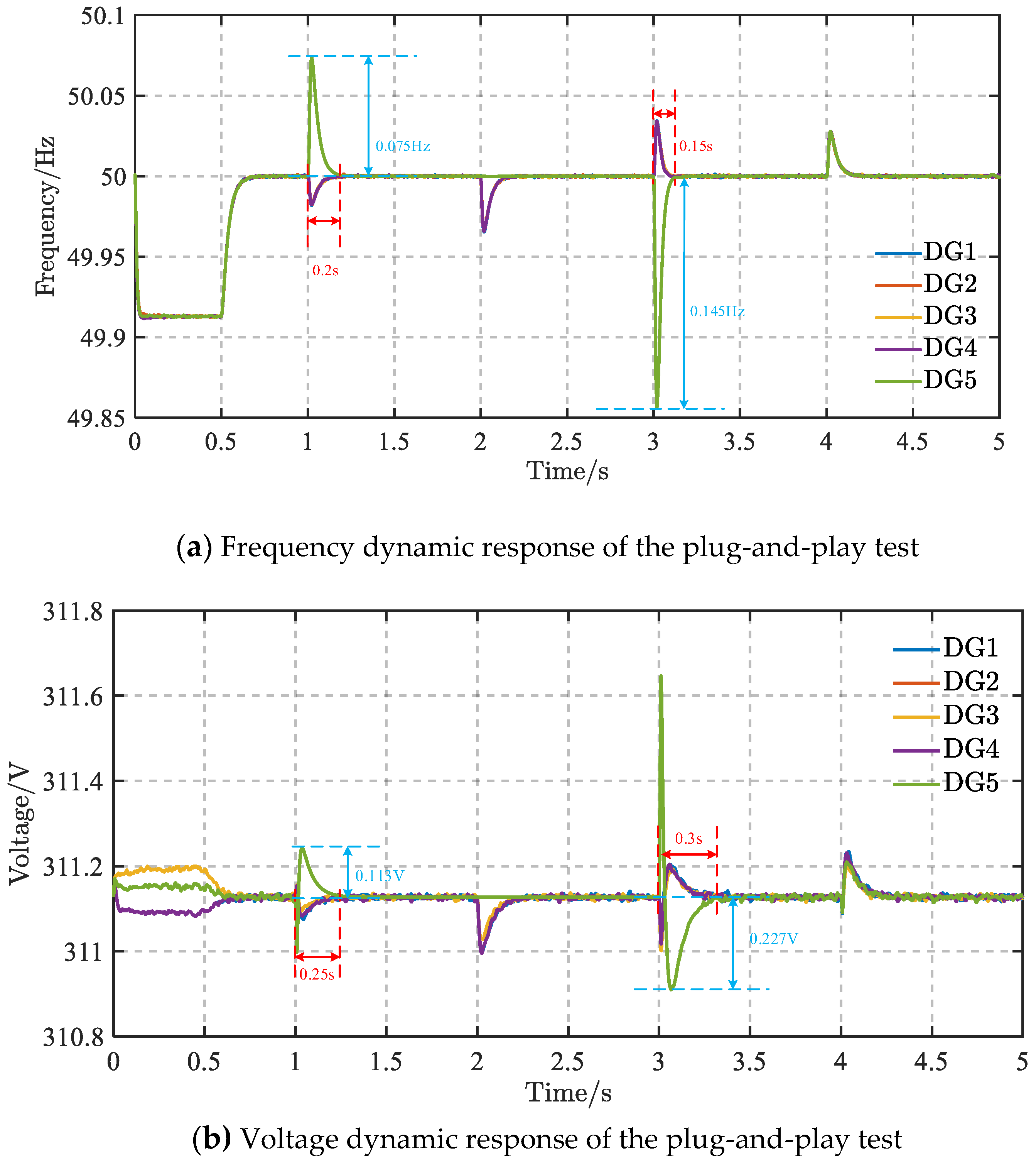 Figure 9b further shows that the voltage amplitudes of all DGs remain well regulated throughout the plug-and-play process. At