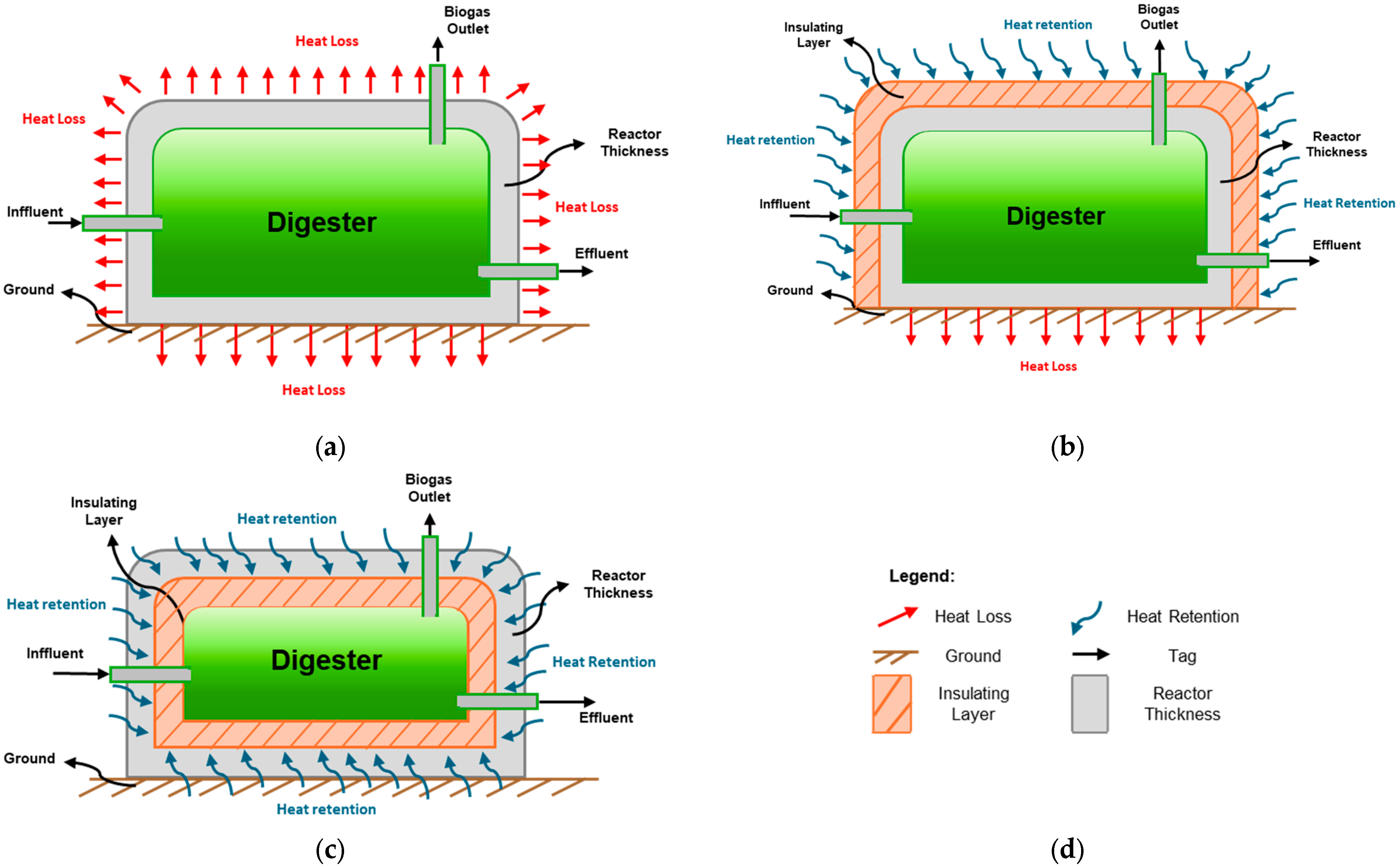 - Pal, A.; Ilango, G.S. Design and Experimental Validation of a Thermal Model for Anerobic Digester for Consistent Biogas Production. Energy 2025, 334, 137632. [Google Scholar] [CrossRef]