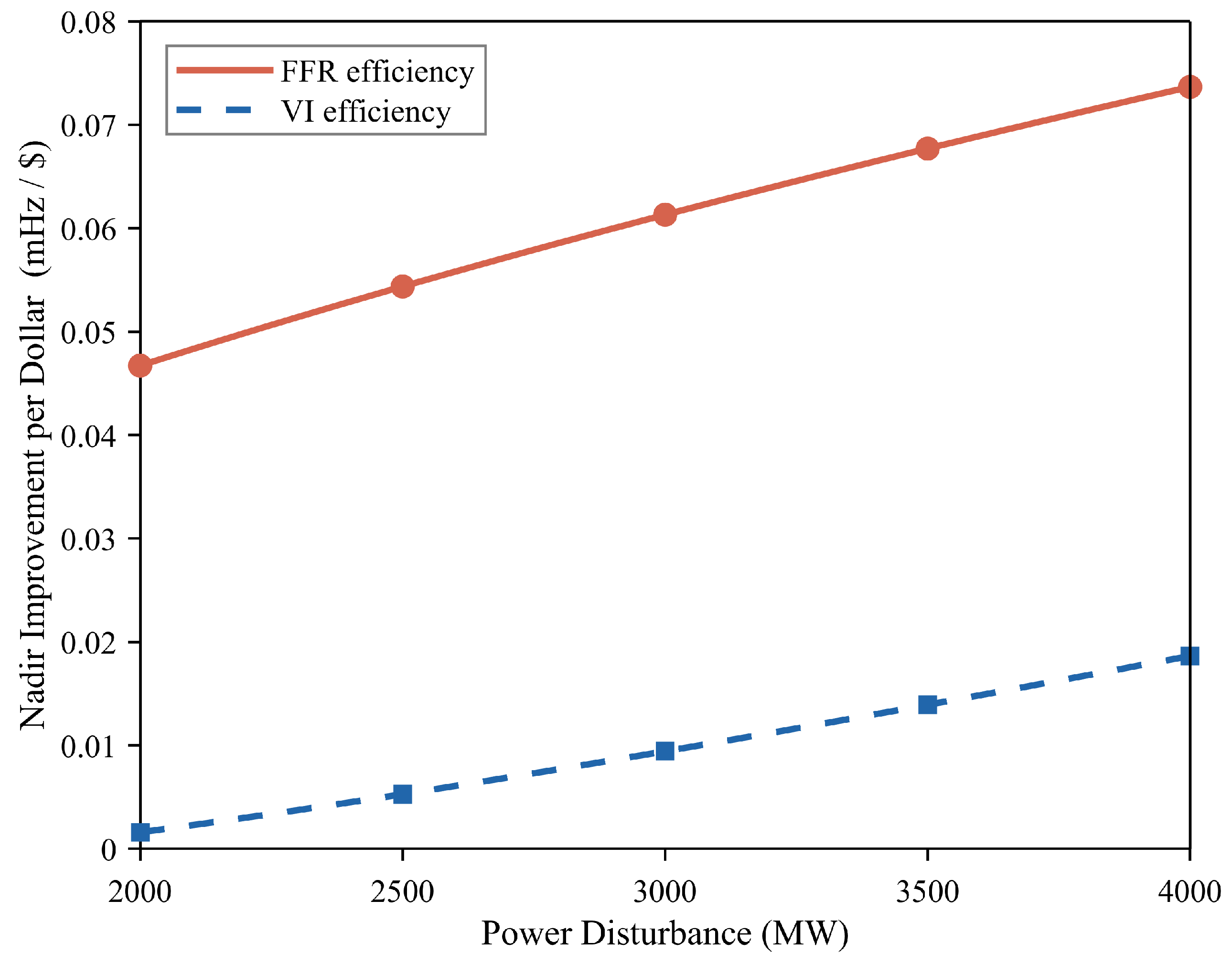 - Once the RoCoF constraint is satisfied, FFR offers significantly higher cost effectiveness for nadir improvement than VI. In high-penetration, large-disturbance scenarios, relying solely on inertia compensation is neither sufficient to satisfy the nadir constraint nor economically viable and the rational configuration of FFR is key to ensuring system frequency security.