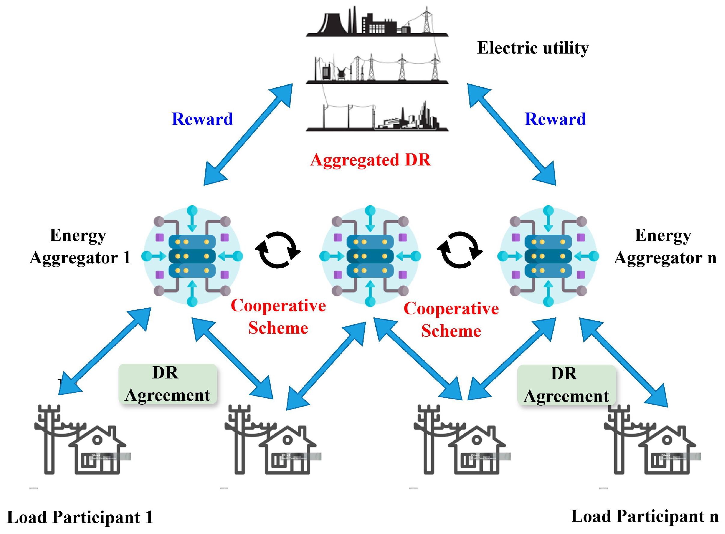 - Fraija, A.; Henao, N.; Agbossou, K.; Kelouwani, S.; Fournier, M. Cooperative price-based demand response program for multiple aggregators based on multi-agent reinforcement learning and Shapley-value. Sustain. Energy Grids Netw. 2024, 40, 101560. [Google Scholar] [CrossRef]