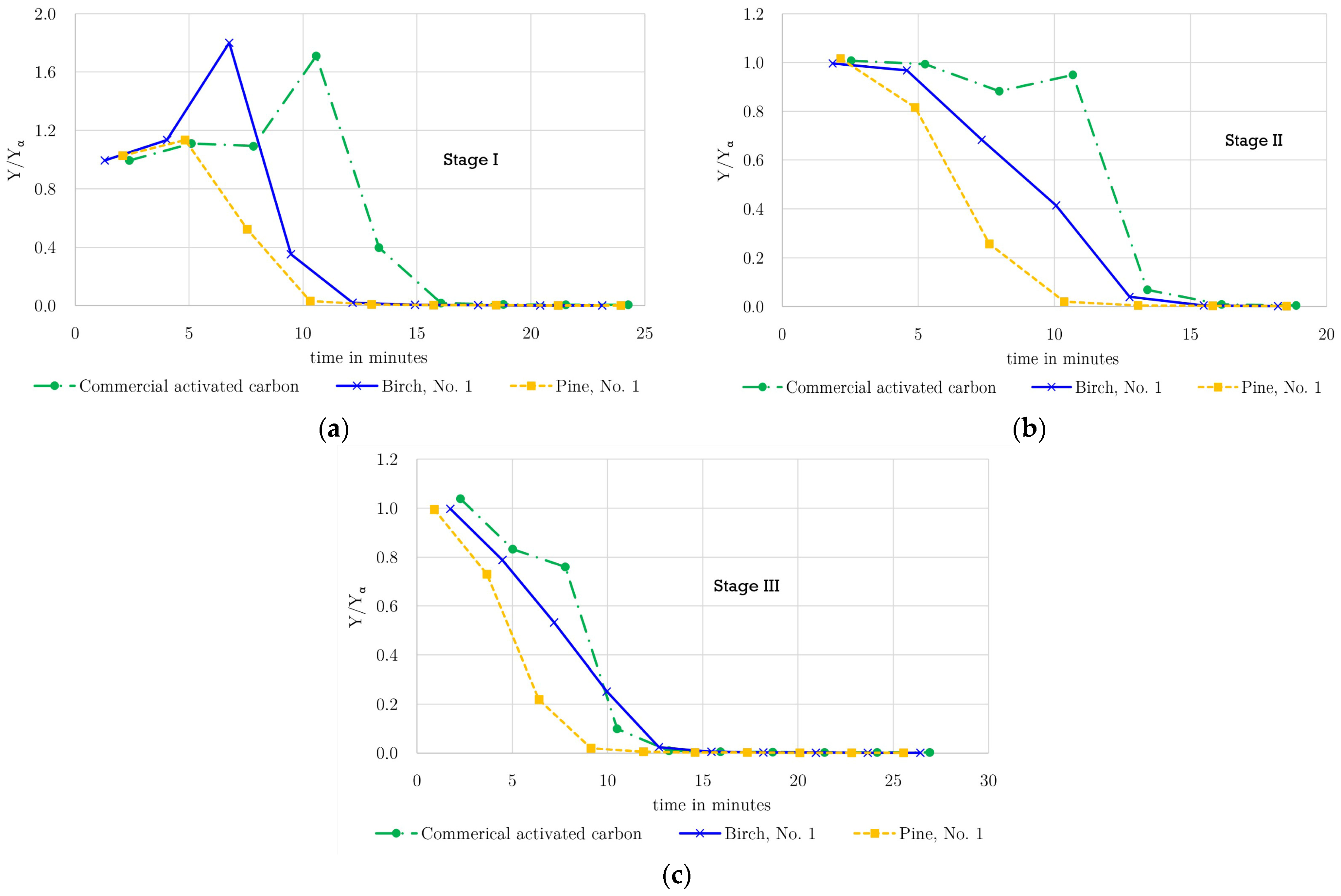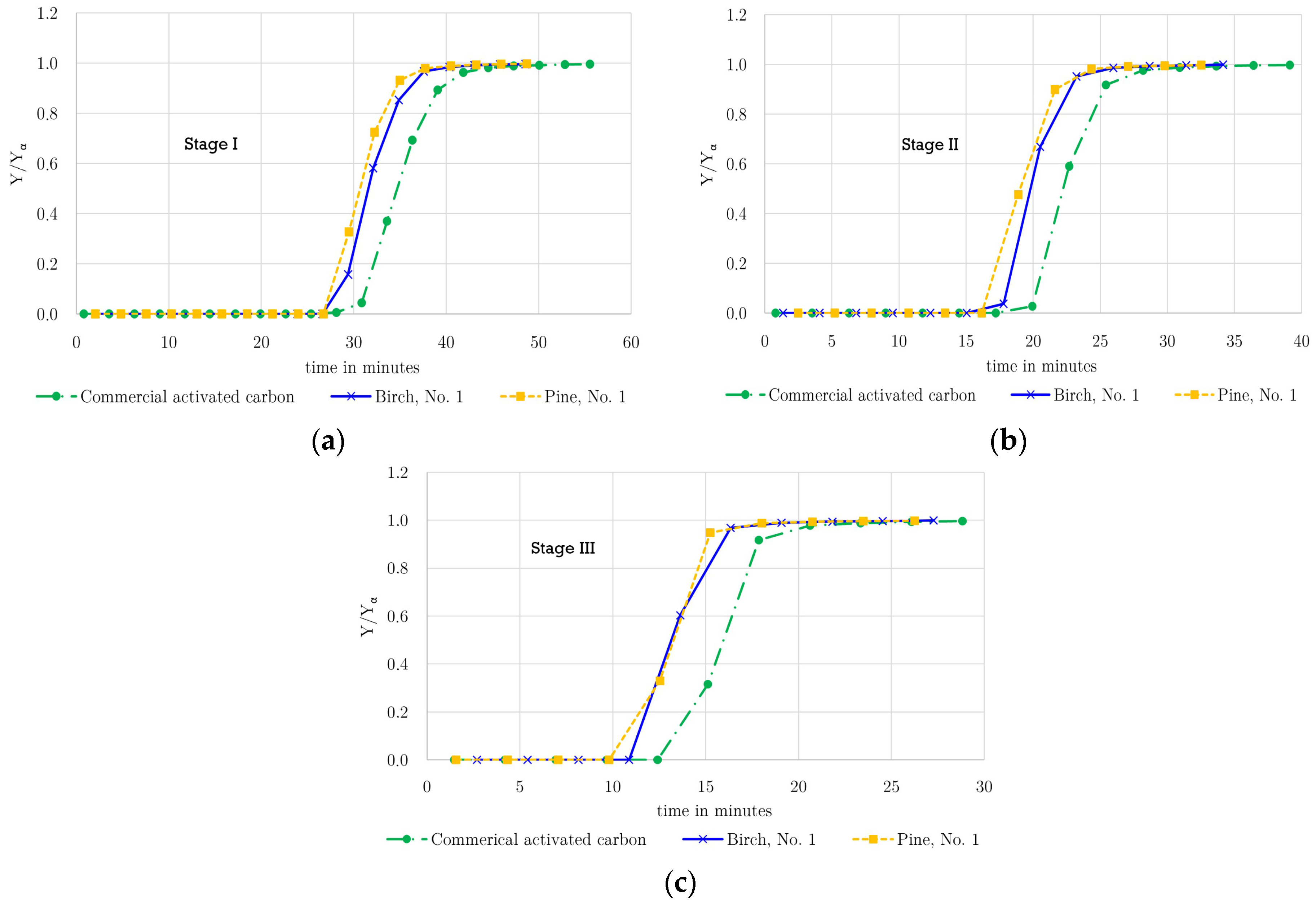 Figure 2 (a: Stage I; b: Stage II; and c: Stage III). For the birch- and pine-derived activated carbons, one representative breakthrough curve is shown and compared with the corresponding curve of the commercial adsorbent. Repeated experiments demonstrated reproducible results in the adsorption measurements, particularly with respect to the breakthrough profiles, which showed consistent behavior across all runs.