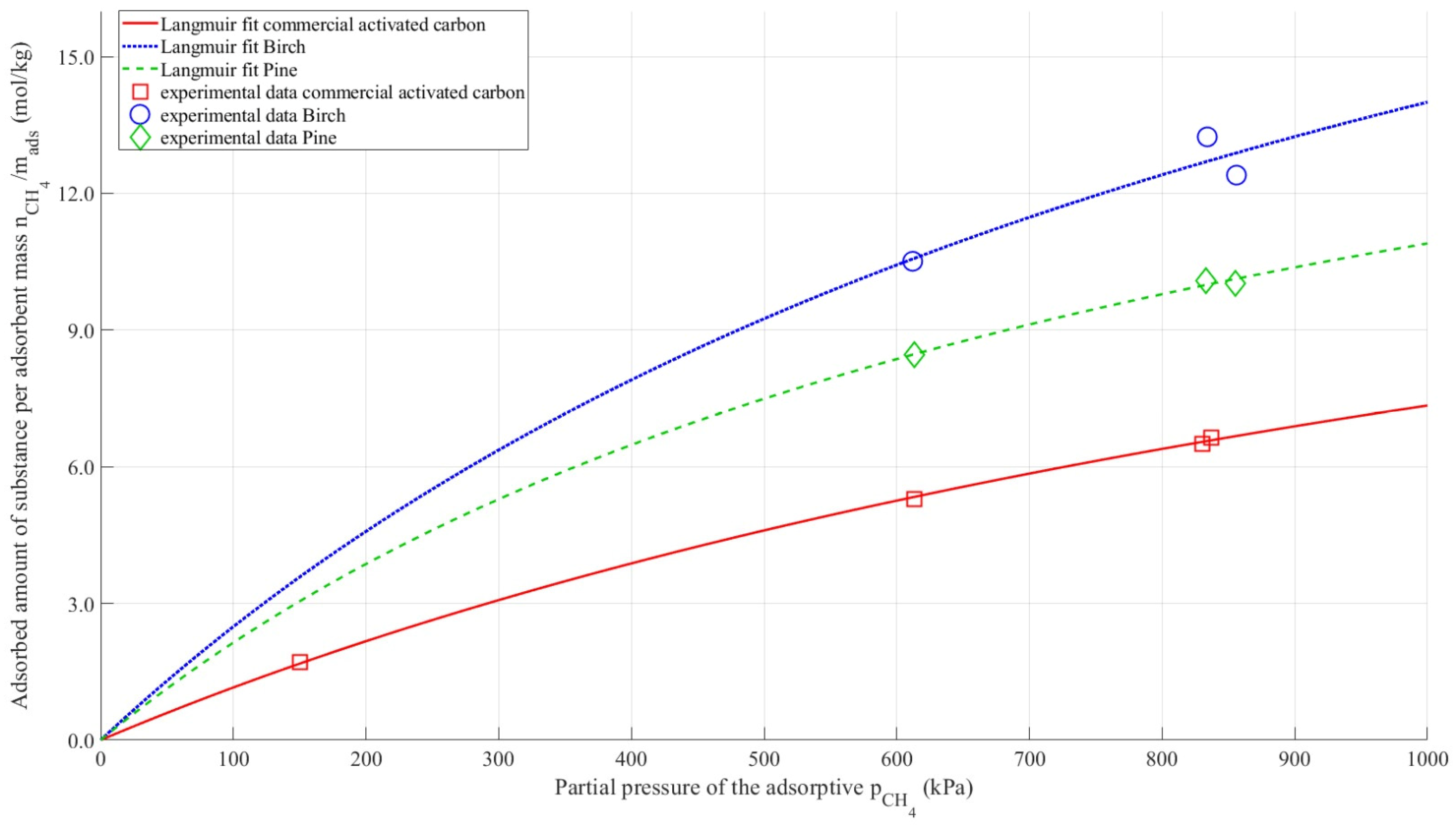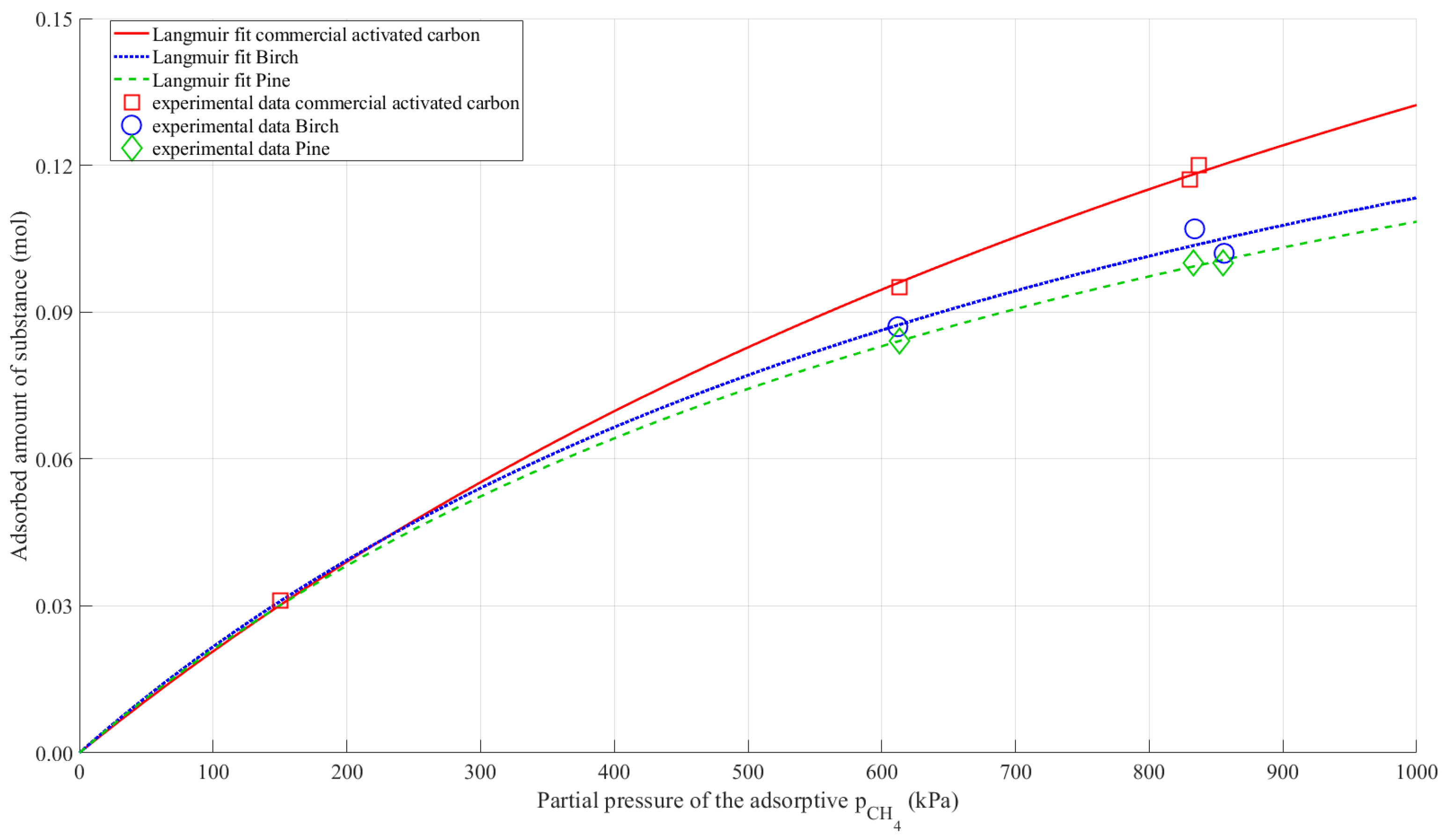 Figure 3 presents the methane adsorption isotherms for commercial, pine-derived, and birch-derived activated carbons, together with the corresponding Langmuir model fits. The values shown in