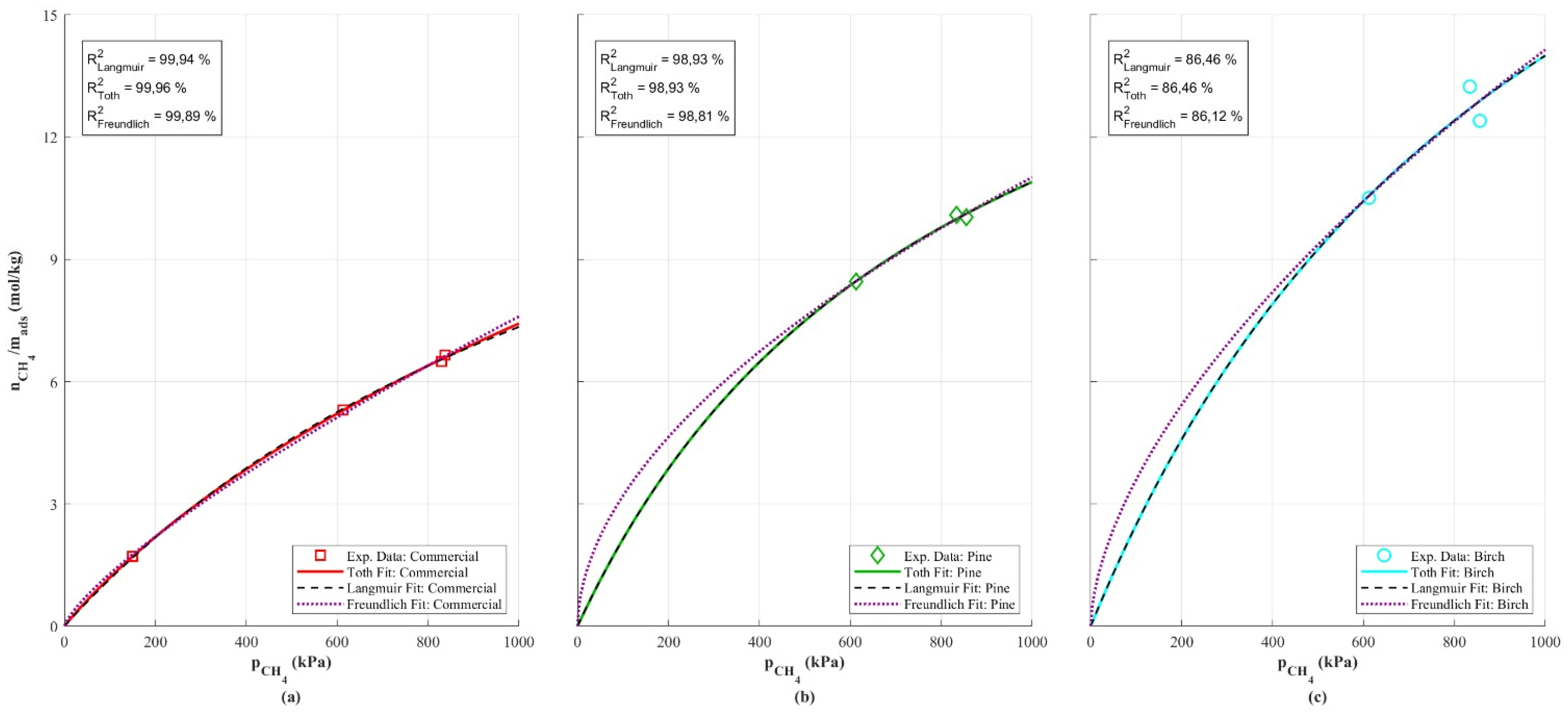 29]. These models were intentionally selected as they represent different base assumptions, e.g., ideal monolayer adsorption on homogeneous sites (Langmuir) and adsorption on heterogeneous surfaces with distributed energy sites (Freundlich and Toth). However, due to the limited number of experimental data points and the fact that a wide range of methane partial pressures was not covered, the application of these models is not intended to yield a rigorous mechanistic interpretation. Instead, the fits are used only for qualitative trend indication to illustrate general trends in adsorption behavior typically observed for activated carbons. The goodness-of-fit values (R