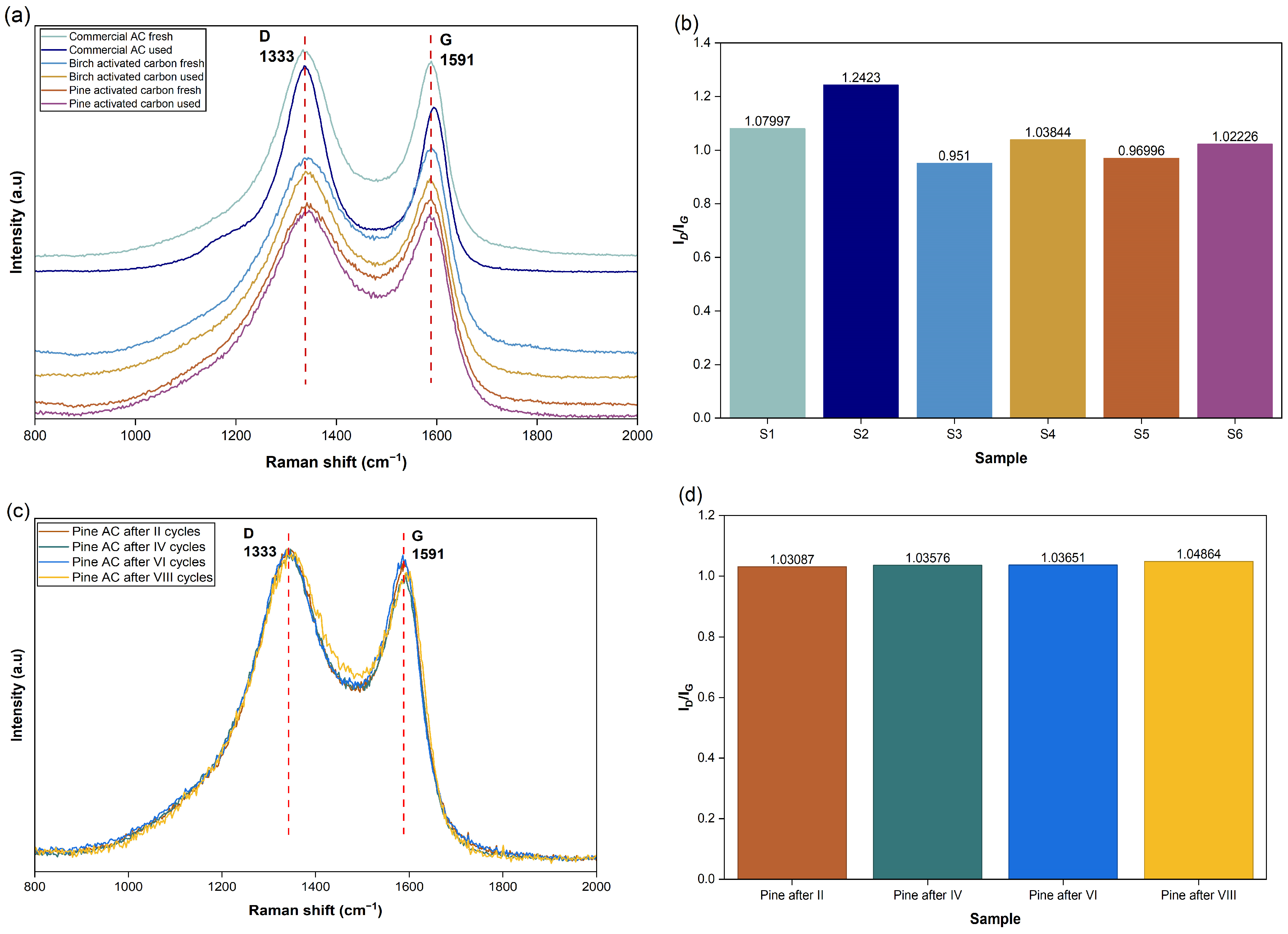 In contrast, the fresh birch-derived activated carbon (S3) shows a lower ID/IG ratio of 0.95, indicating a comparatively higher degree of structural order. After PSA operation (S4), the ratio increases slightly to 1.04, indicating a limited increase in disorder. A similar trend is observed for the pine-derived activated carbon, where the ID/IG ratio increases from 0.97 for the fresh sample (S5) to 1.02 after PSA cycling (S6).