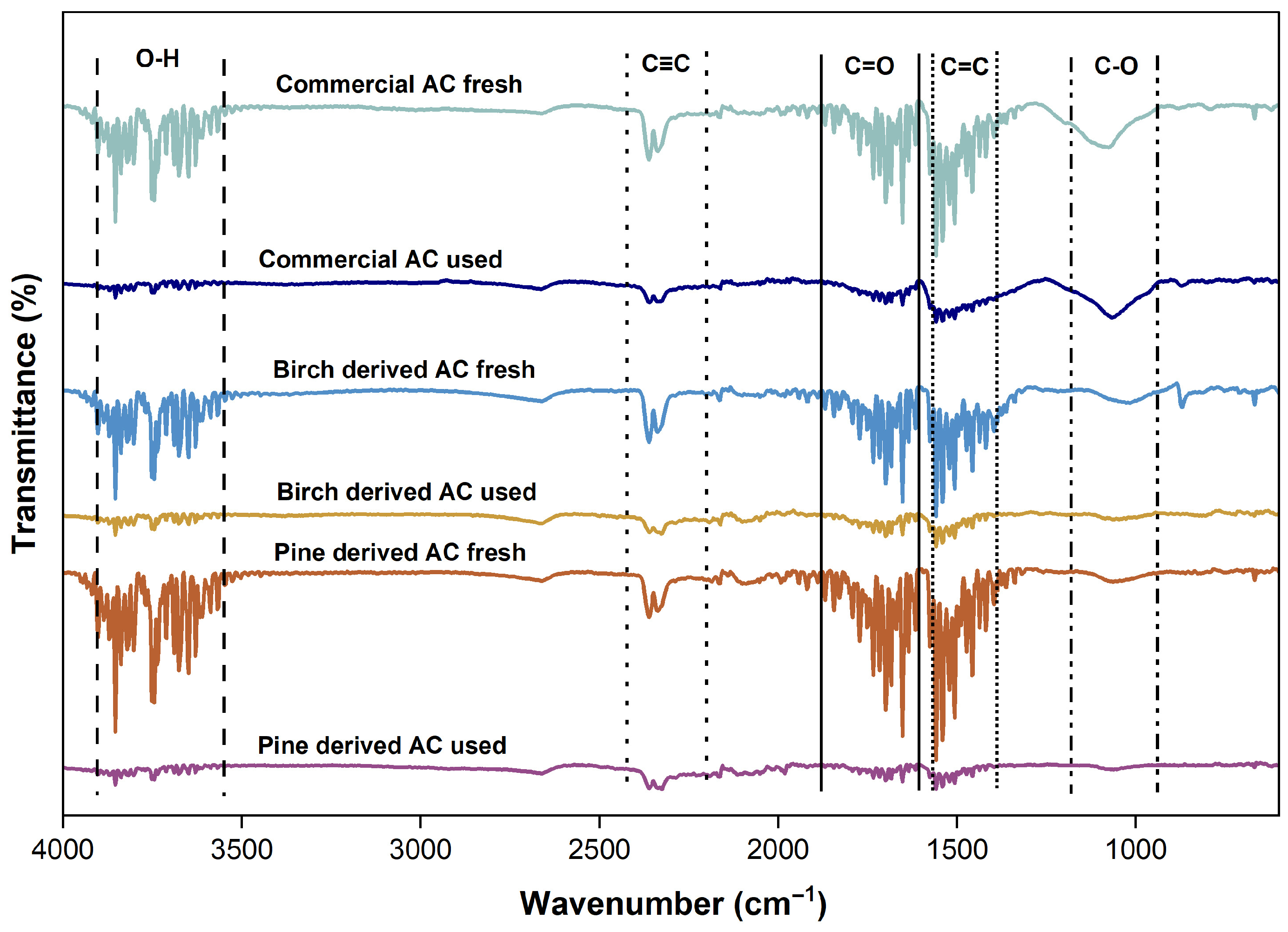 The surface chemistry of the commercial and biomass-derived activated carbons before and after PSA operations was examined by FTIR spectroscopy, as presented in