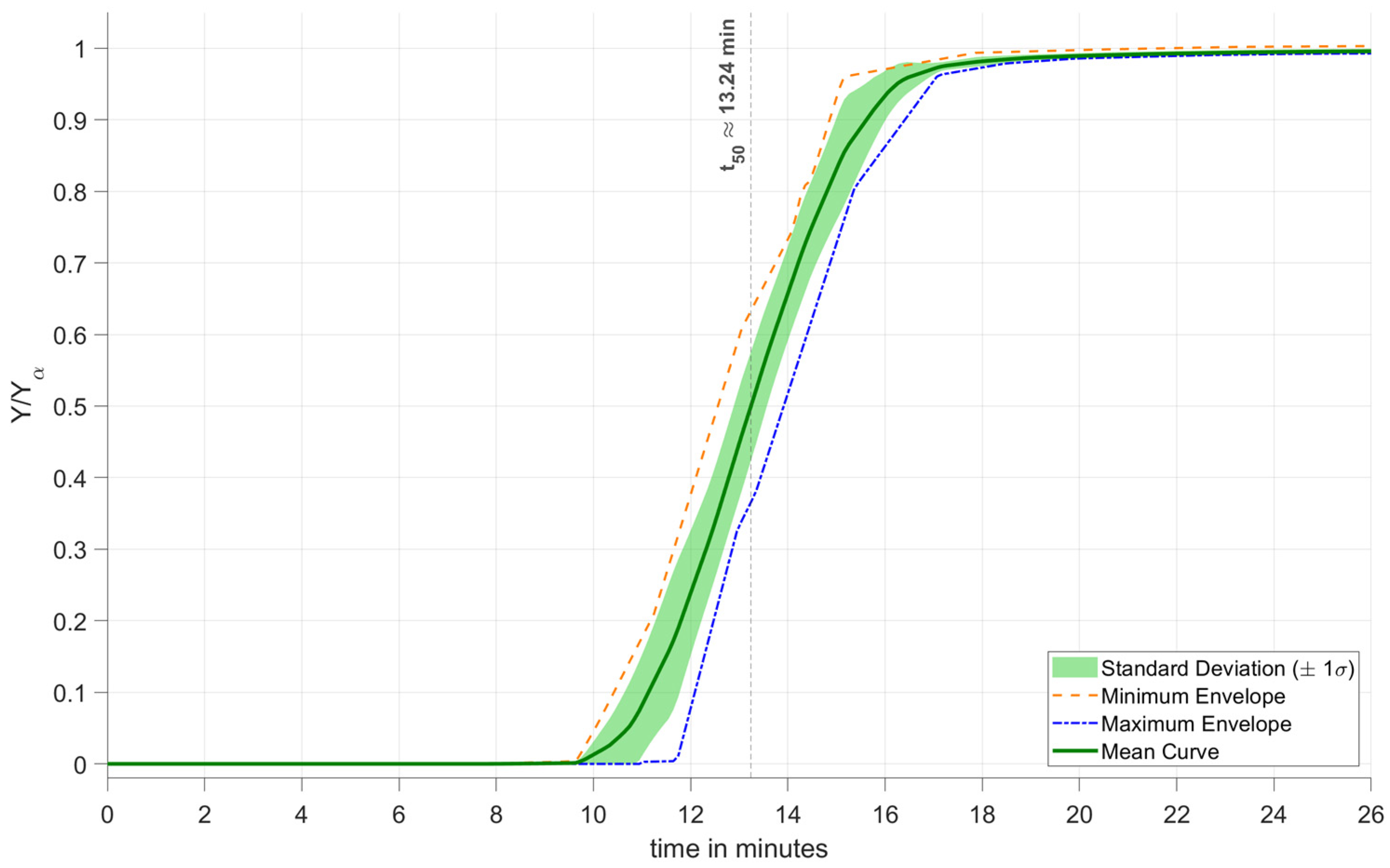 To quantitatively assess the reproducibility and stability of the adsorption performance, the ten breakthrough curves were statistically processed using MATLAB R2024b. Because the experimental curves were recorded at slightly different time intervals, a synchronization procedure was first applied. A uniform time axis ranging from 0 to 26 min was generated, and each individual breakthrough curve was interpolated onto this common grid. For each curve, 300 equally spaced time steps were calculated, compared to the original 9–10 experimentally measured data points within the same time range. This interpolation enabled a direct point-by-point comparison of all ten experiments. At every single time step, the script calculated the mean value between the 10 curves and the standard deviation. The solid line represents the mean breakthrough curve, and the shaded region corresponds to ±1 standard deviation (±1σ). The narrow width of the shaded band over the entire breakthrough region demonstrates excellent reproducibility of the adsorption behavior. The low statistical dispersion indicates that no significant performance degradation or progressive loss of adsorption capacity occurred during repeated high-pressure cycling. The script calculated the t50 point of the mean value curve, t50, which is the time at which the system reached 50% of its capacity. The calculated value of t50 ≈ 13.24 min confirms the consistent adsorption capacity of the pine-derived activated carbon across all ten cycles. The absence of any systematic shift in the breakthrough front suggests that the material maintains stable adsorption and pore accessibility under repeated pressurization and regeneration.