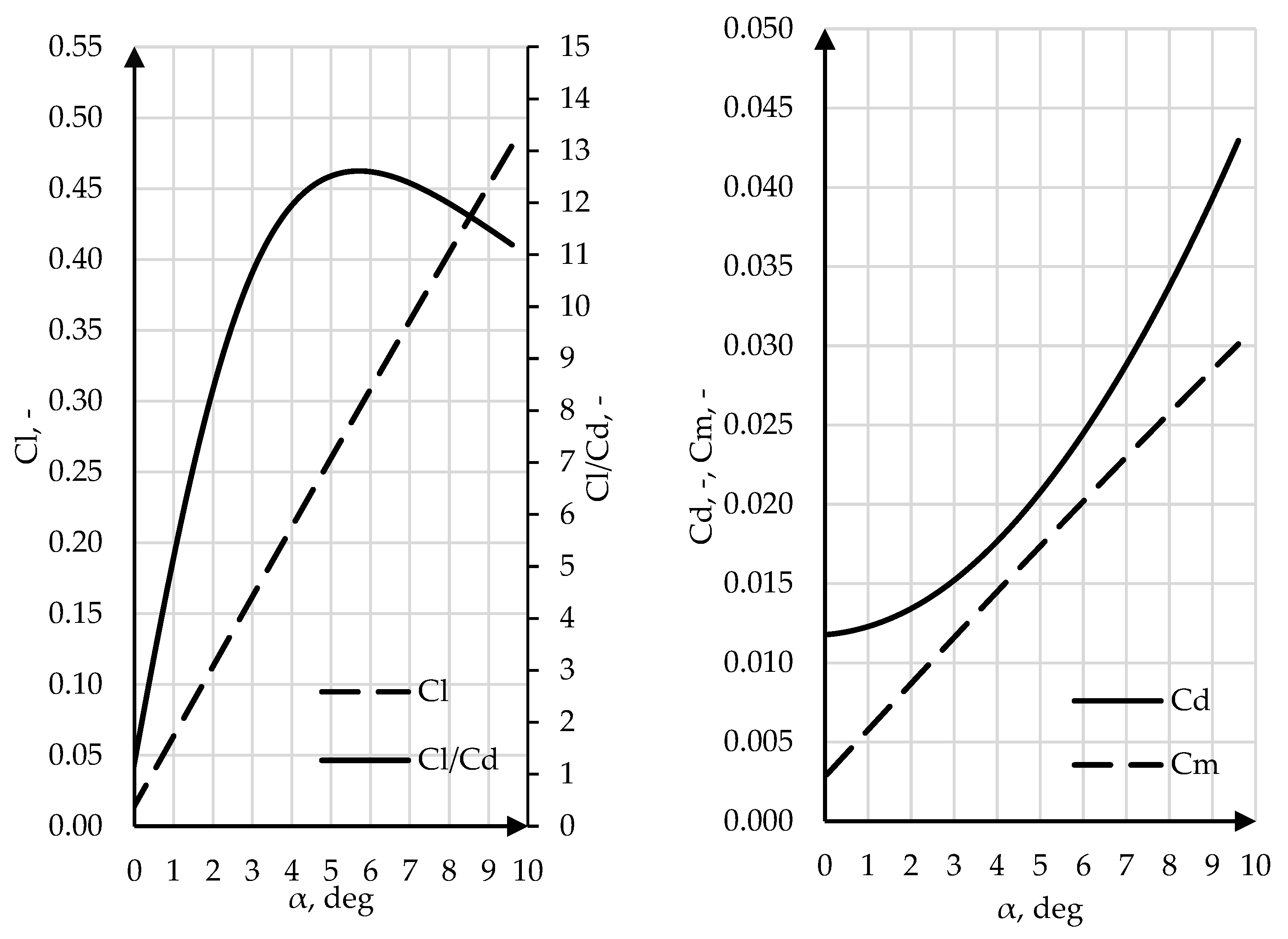 16]. Simultaneously, the drag increase is significant, requiring assistance from the available thrust excess to maintain steady flight. As the angle of attack increases, lift rise may be useful at lower airspeeds or when lifting heavier loads. On the other hand, drag increases more rapidly. This disproportionate growth in drag generated by the airframe requires greater thrust, leading to higher power consumption and reduced endurance, which is particularly important for the research shown in this paper.