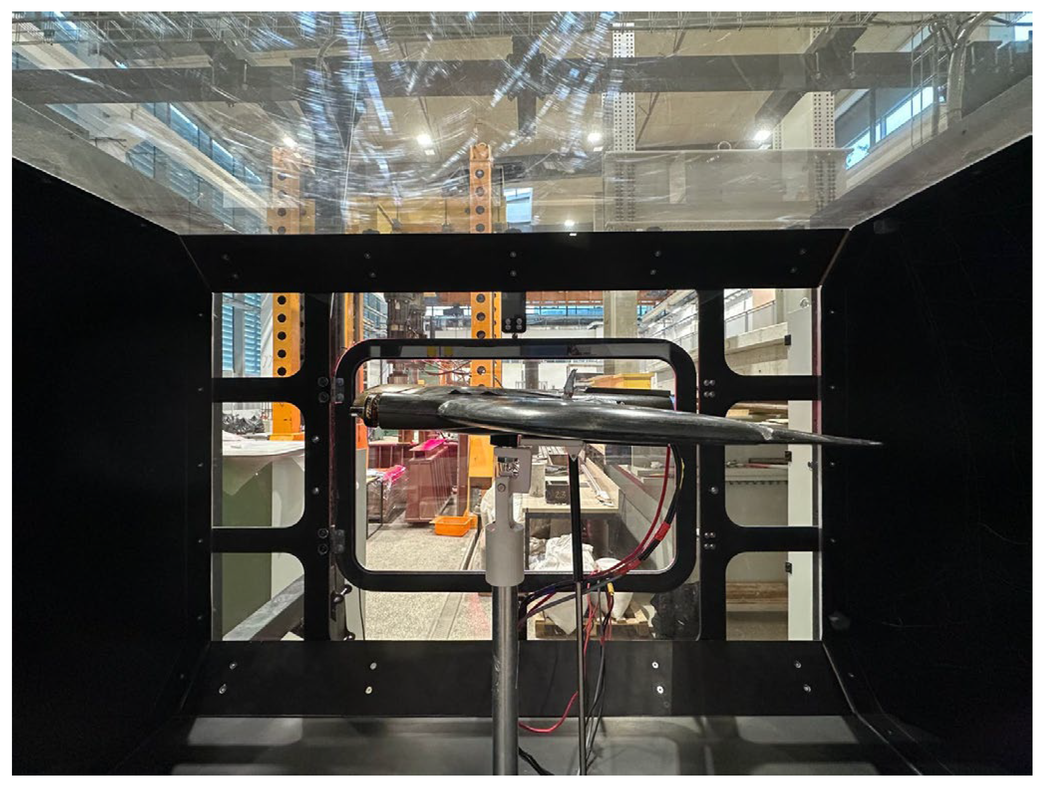 The UAV was installed in the test section of a low-speed aerodynamic wind tunnel (