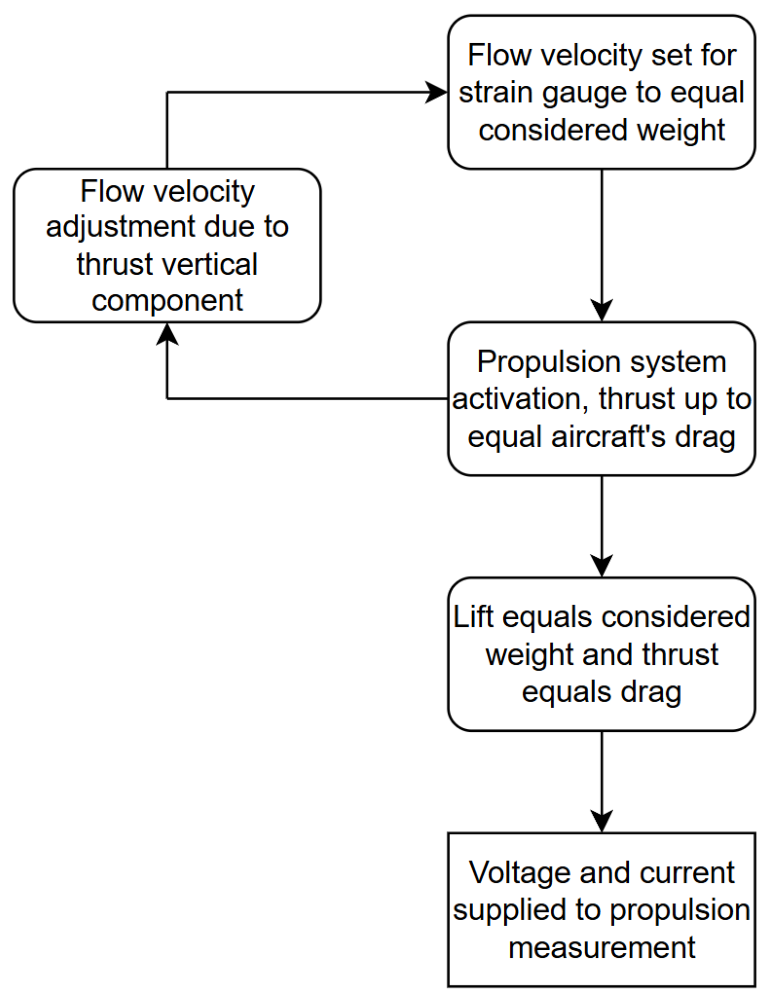 Once the target lift level was reached, the UAV’s propulsion system was activated. The propulsion thrust was progressively increased until the balance reading in the drag axis reached zero. This condition corresponds to horizontal force equilibrium, in which the thrust generated by the propulsion system exactly balances the aerodynamic drag acting on the aircraft, thereby representing steady, level flight conditions. Activation of the propulsion system introduced an additional vertical force component due to the thrust vector’s inclination, resulting in a temporary increase in the measured lift force. To compensate for this effect and restore the target lift corresponding to the selected operating mass, the freestream velocity was reduced accordingly. Subsequently, the propulsion power was adjusted to achieve zero net force in the drag direction once again. This iterative process (