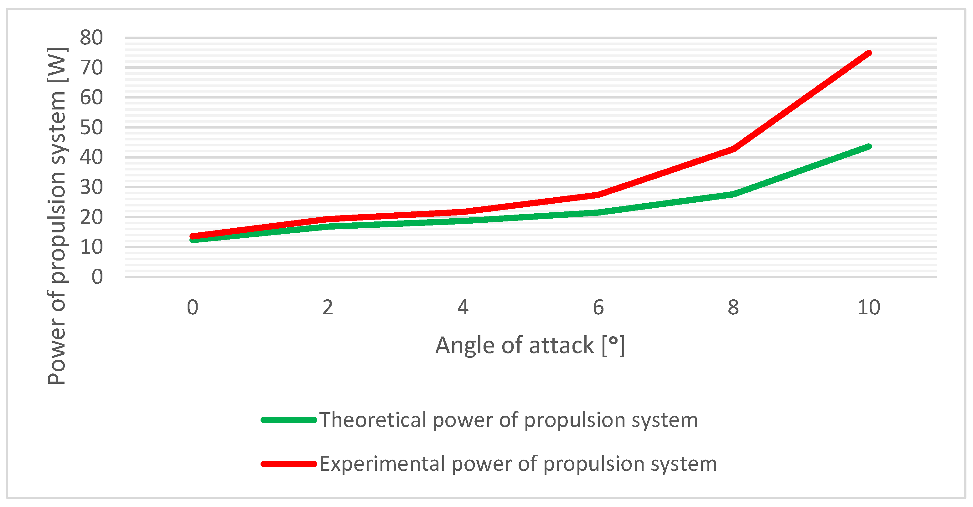 At higher angles of attack, however, the deviation between experiment and theory increases significantly. In the range from 6° to 10°, experimentally measured power consumption exceeds theoretical predictions by approximately 50–80%, depending on the operating mass. This large discrepancy cannot be explained solely by additional drag.