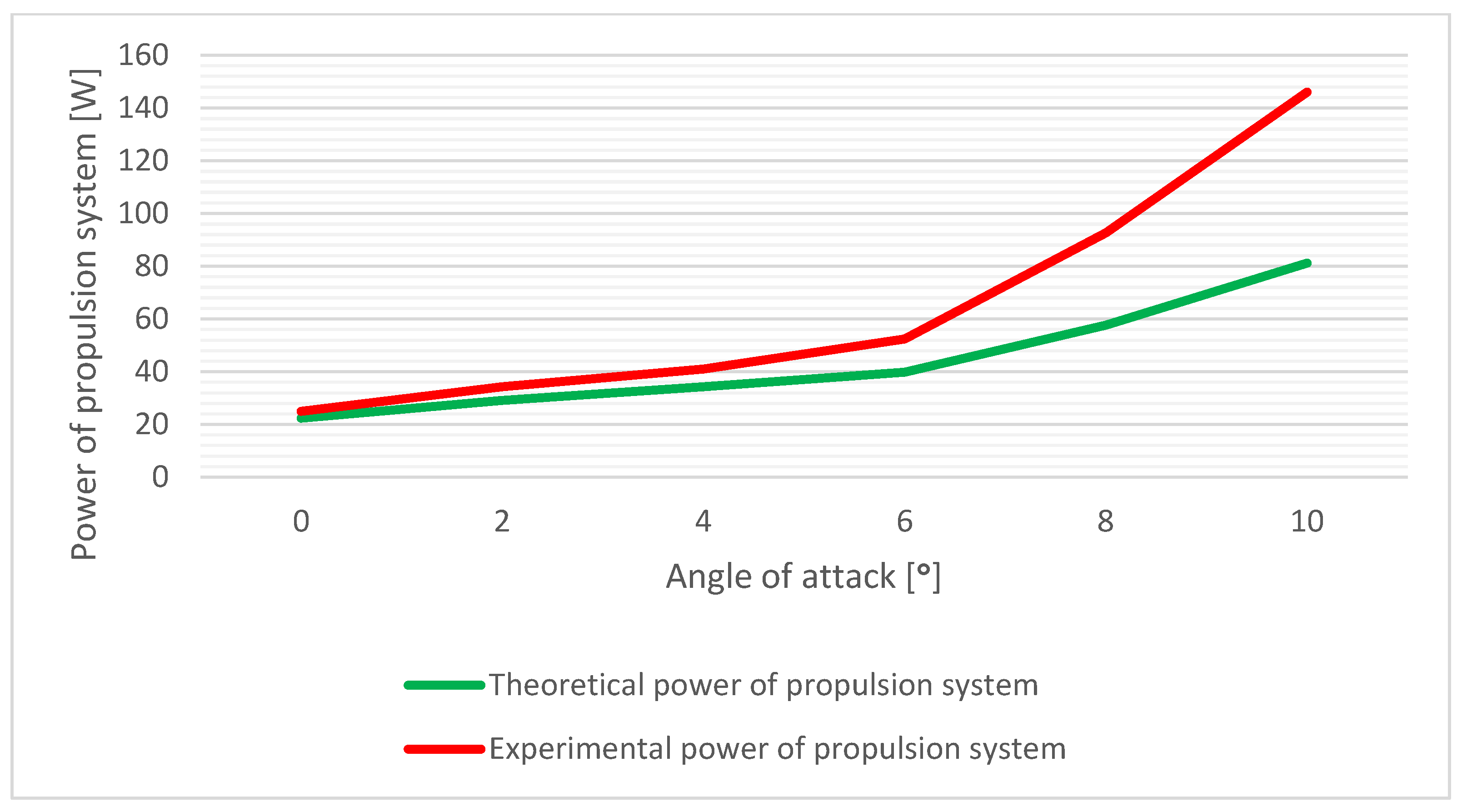 For each operating mass in a function of angle of attack and condition of level light, the power of propulsion system, and energy consumption of a 5 min flight obtained analytically, based on numerical analysis of a UAV, were compared to an experimental test of a UAV and can be seen in