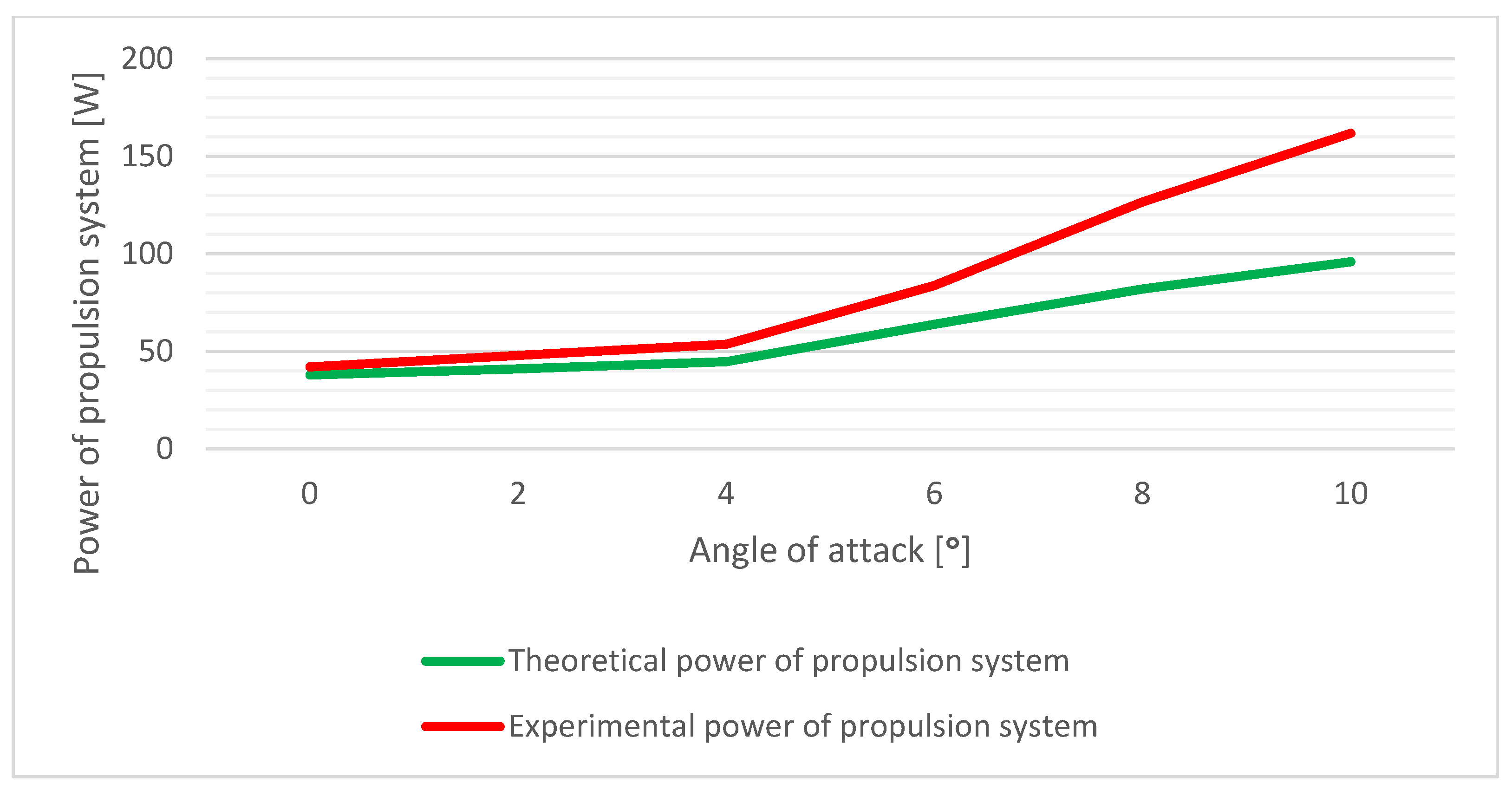 A key outcome of the study is steady overconsumption of power at low and moderate angles of attack, compared with the theoretical panel model. In the range from 0° to 6°, the experimentally measured propulsion power is typically 10–20% higher than the values predicted by the panel method-based model. This discrepancy is considered physically justified, as the numerical model represents only the idealised lifting-surface aerodynamics. In contrast, the real aircraft includes additional drag sources not represented in the panel model, such as propulsion units, antennas, control surface gaps, wiring, surface roughness, and other installation effects. These components introduce additional drag, increasing thrust demand. The relatively small magnitude of the difference indicates that the panel-method approach provides a reliable first-order prediction of power consumption in this operational range.