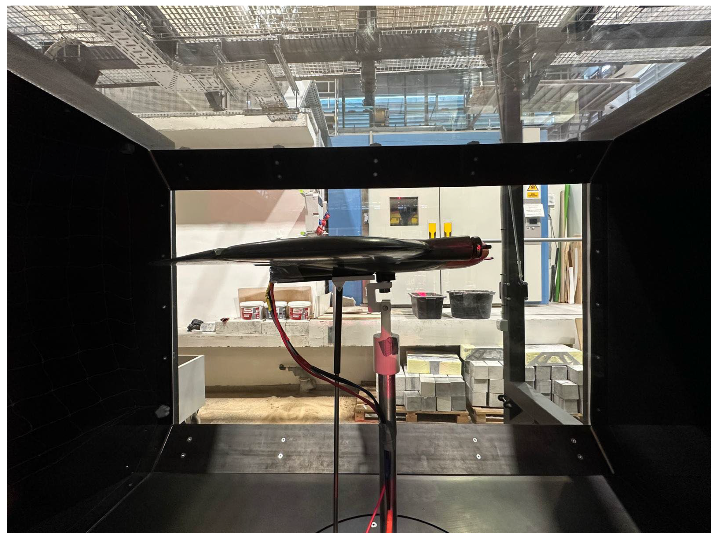 The experimental setup consisted of the UAV mounted inside the wind tunnel (