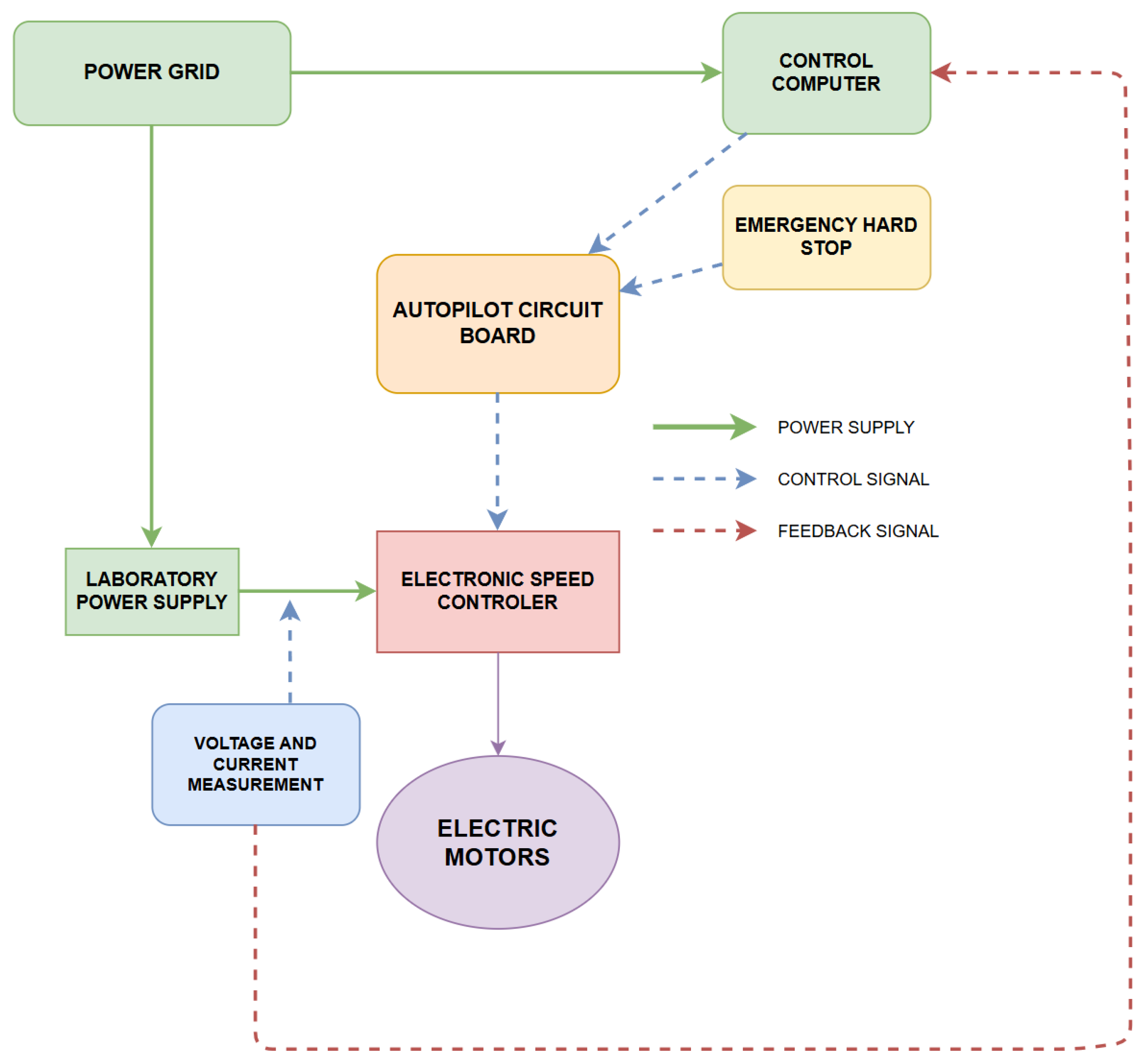 The propulsion system was controlled via an autopilot running ArduPilot 4.6.3 software, installed on a separate control computer. The pulse width modulation (PWM) signal commanding the propulsion system was generated by the autopilot, while electrical power was supplied by a laboratory-grade power supply. This configuration (