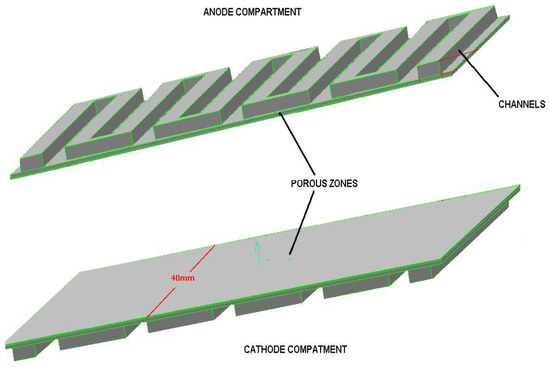In order to compare the results from the developed simplified model and the FLUENT PEMCF Module, a bipolar plate design have been established and solved with both software tools. The geometry and dimensions of the bipolar plate are shown in Figure 1, where the geometry for the simplified model has been represented for the anode and cathode sides. Both BPs have the same configuration and dimensions. The active surface area is 40 × 40 mm2, with ten channels in a serpentine flow field configuration. The channels are 2 mm in width and 1 mm in depth. The width of the rib is 2 mm. The thickness of the porous zones is 0.354 mm, which is equivalent to the thickness of the gas diffusion layer and the catalytic layer according to [7].