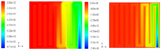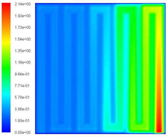 The water removal capability of each plate is shown in Table 4. The effect of including various inlets and outlets as in cases 10 and 11 leads to an increase of the removed water. Another effect observed is that the quantity of removed water in the design with various serpentine zones is less than the removed quantity in the simple one. According to the results obtained, the design with the best water removal capability is the “pin” type configuration. However, it is well known [1] that a pin design flow field typically presents channelling effects, formation of stagnant areas, uneven reactant distribution, and inadequate water removal. This is because reactants flowing through such flow fields tend to follow the path of least resistance, leading to a minimal pressure drop but also to poor water removal. Therefore, this particular result obtained for the pin type configuration must be reconsidered and further analysed as it does not reproduce the typical behaviour observed in such BPs.