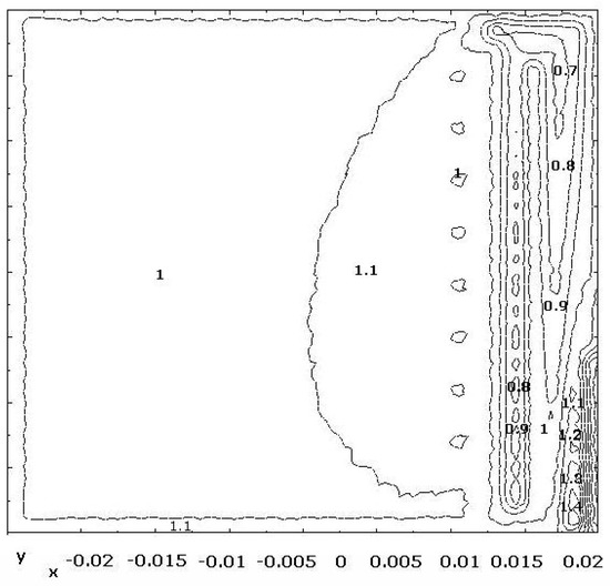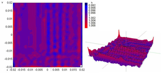The values of h for every location (x,y) must be the unity. Figure 4 represents this magnitude. Maximum and minimum values are 1.008 and 0.992, respectively. Hence, it is verified that for every point of the active surface, the values of current densities in both electrode surfaces, can be considered to be identical.