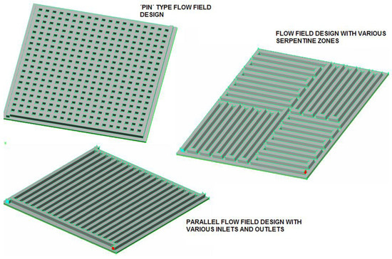 Different flow field designs studied in the sensitivity analysis.
