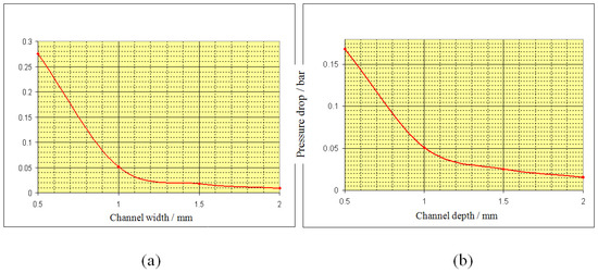 Pressure drop for cases varying channel width (a) and channel depth (b).