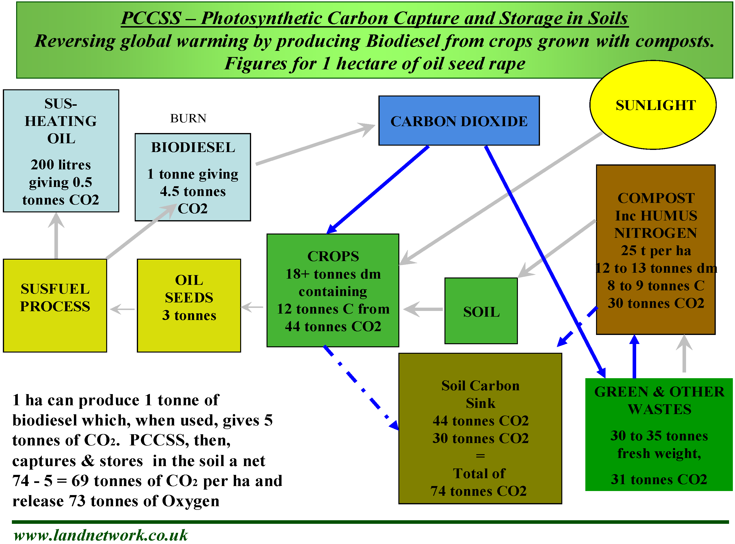 For all countries and societies in the world, there is a relationship between the population numbers and the amounts of economic growth and wastes produced by human activity. As populations increase, so does demand for fuel and energy. The summits at Rio, Kyoto and (to be at the time of writing) Copenhagen all demonstrate increasing concern about global warming. The purpose of this research was and remains to investigate one particular commercial recycling route in order to establish and develop its credentials in terms of recycling wastes to land, the technology of the mechanisms involved and the use of that technology to reduce and eliminate pollution, reduce energy demands, produce biofuels and put figures on sustainability in terms of carbon dioxide removed from the atmosphere and oxygen put back in. The description of the mechanisms and the figures from the research confirm that there is a potentially significant part to be played by Photosynthetic Carbon Capture and Storage in Soils (PCCS) in the arrest and reversal of global warming [1].