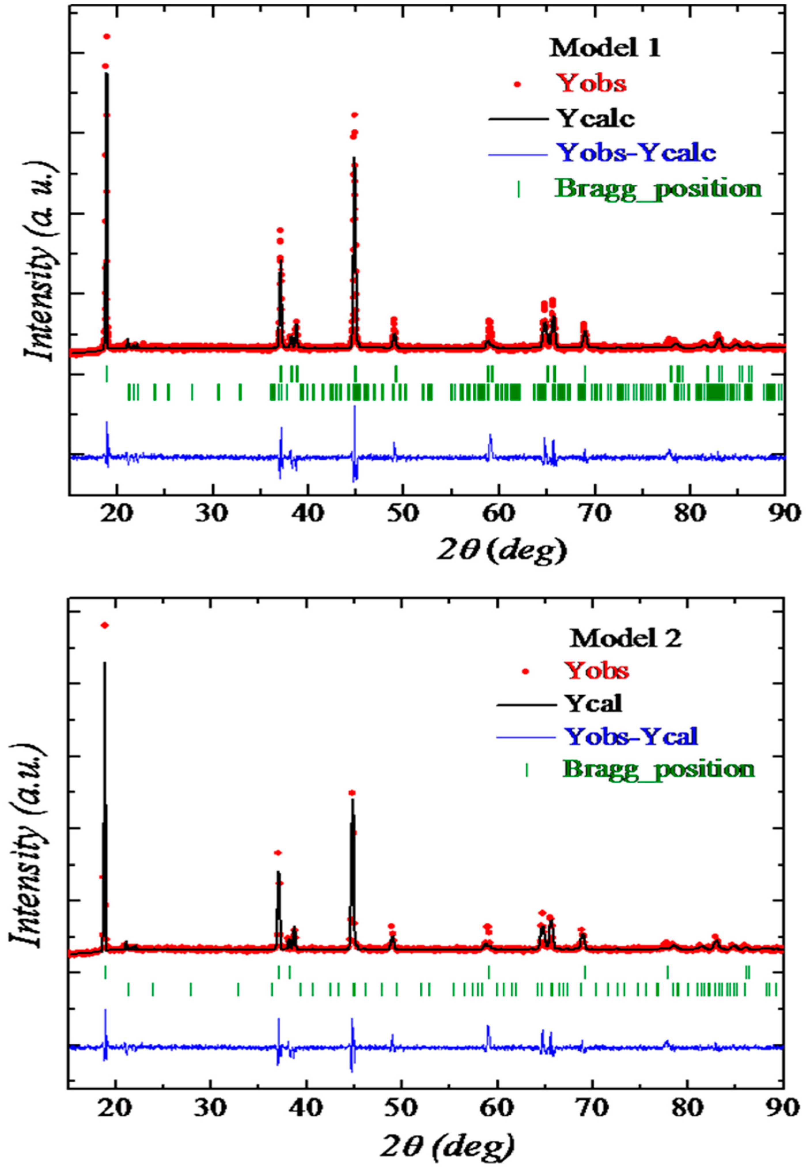 | Model 2 | a = 2.842(2) c = 14.136(7) | 0.247(3) | 0.982 | z(Ni) 0.017 | 1.21 | 8.10 | 12.6 | Ni-O 2.013 Li-O 2.027 | O-Ni-O 89.79 O-Li-O 89.05 |
