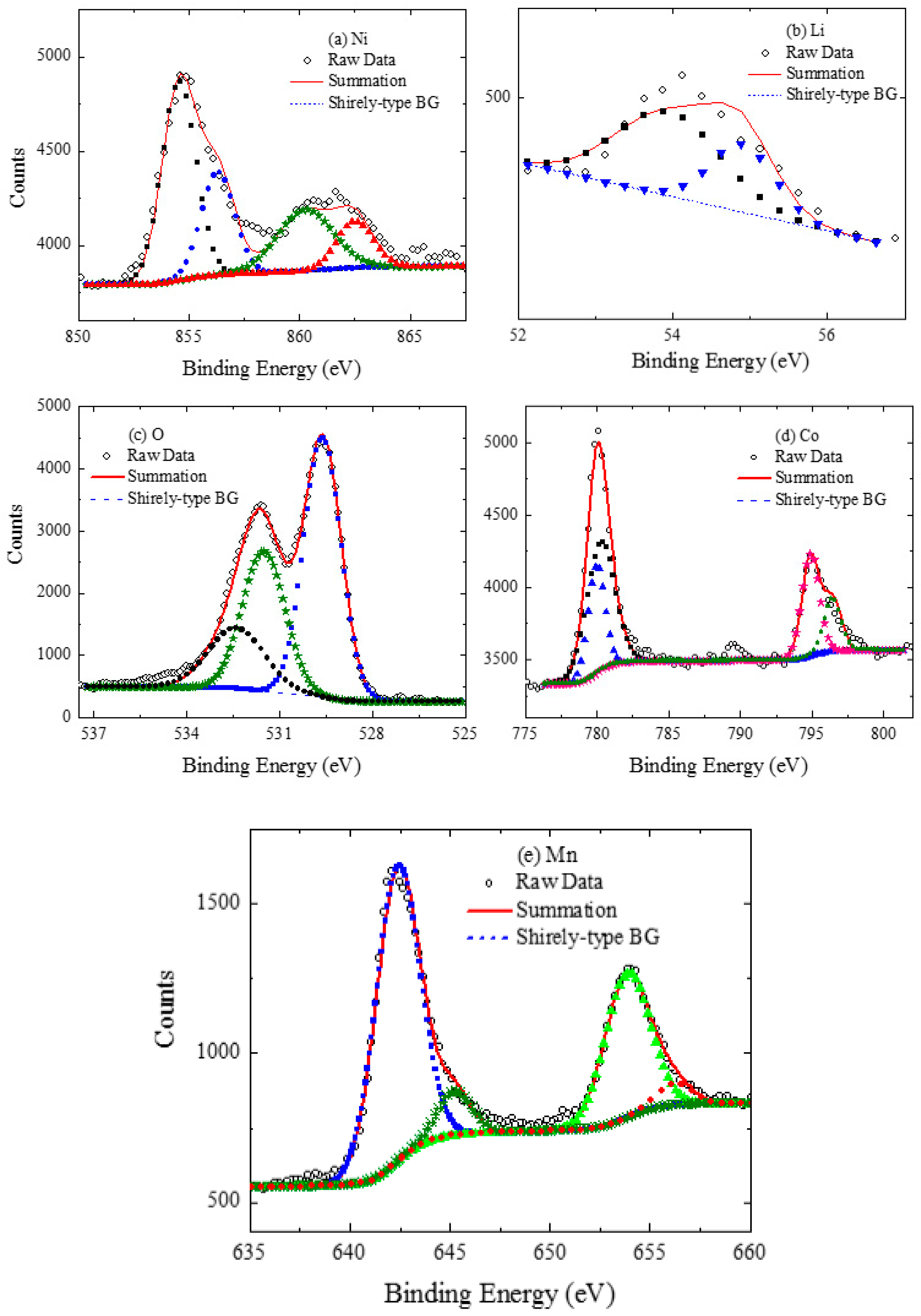 - Mansour, A.N. Characterization of LiNiO2 by XPS. Surf. Sci. 1994, 3, 279. [Google Scholar] [CrossRef]