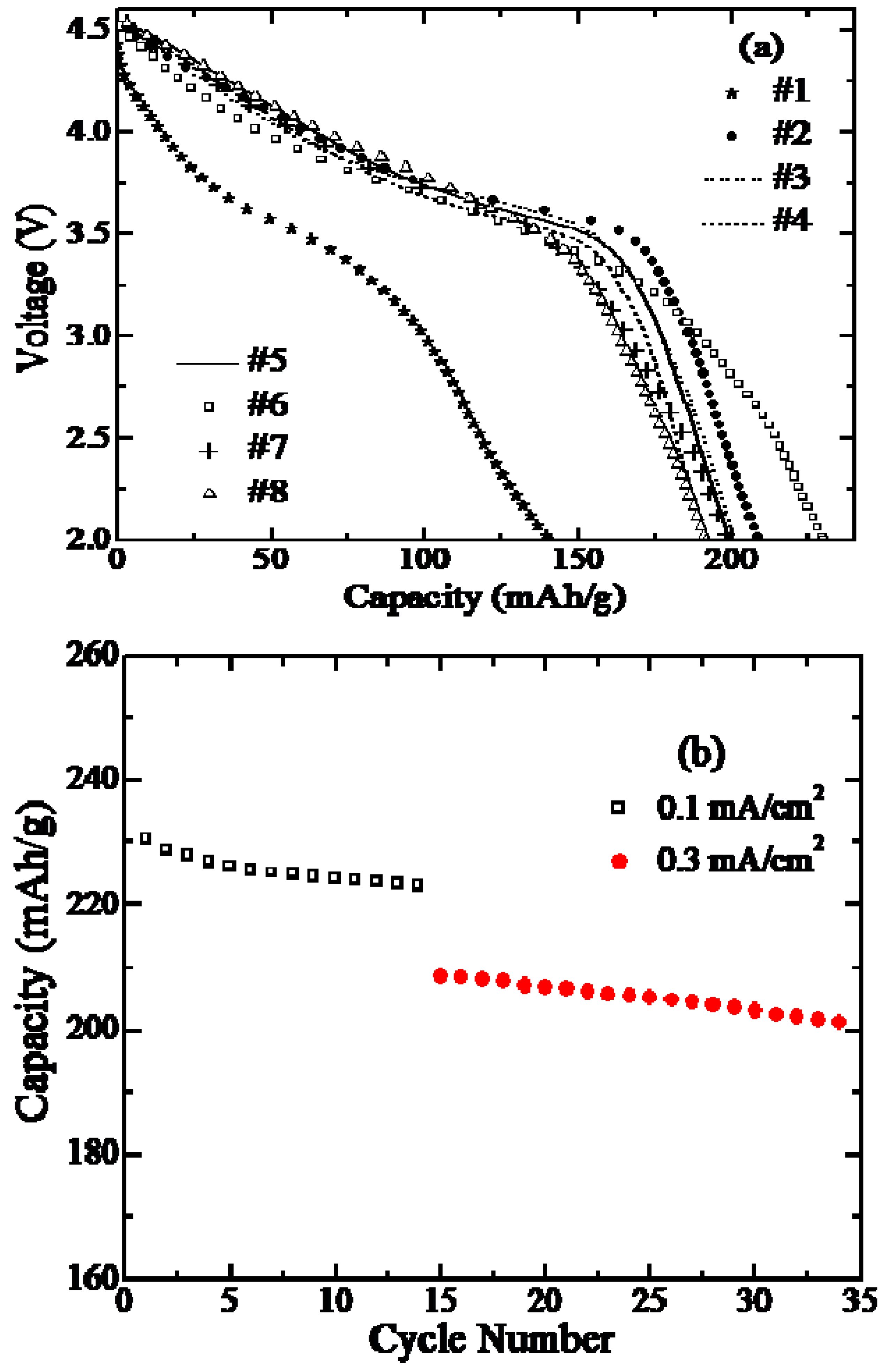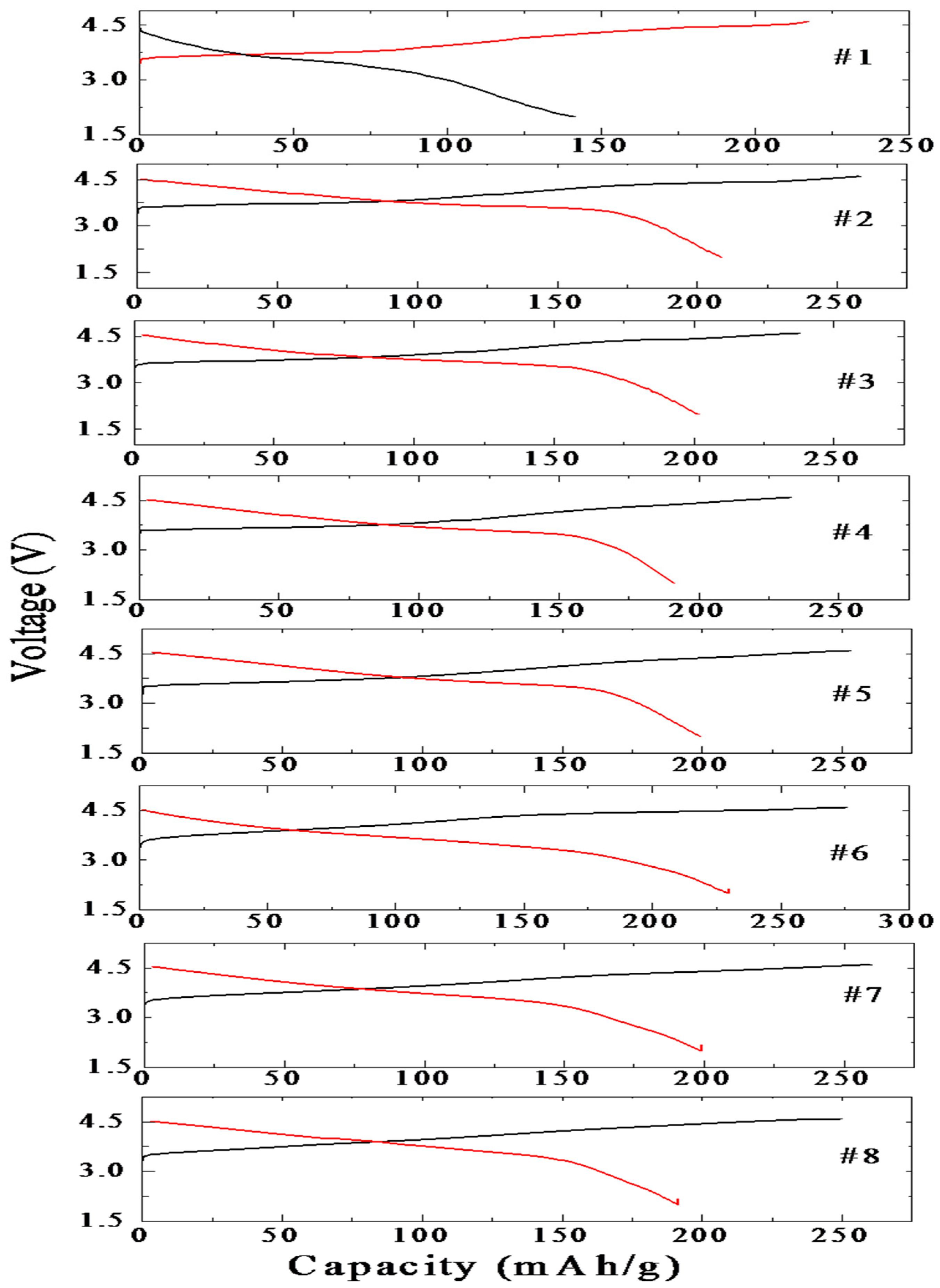 | #5 | Li1.067Mn0.133Ni0.32Co0.48O2 | 2.848(6) | 14.080(2) | 177 | 183 | 189 | 199 | |