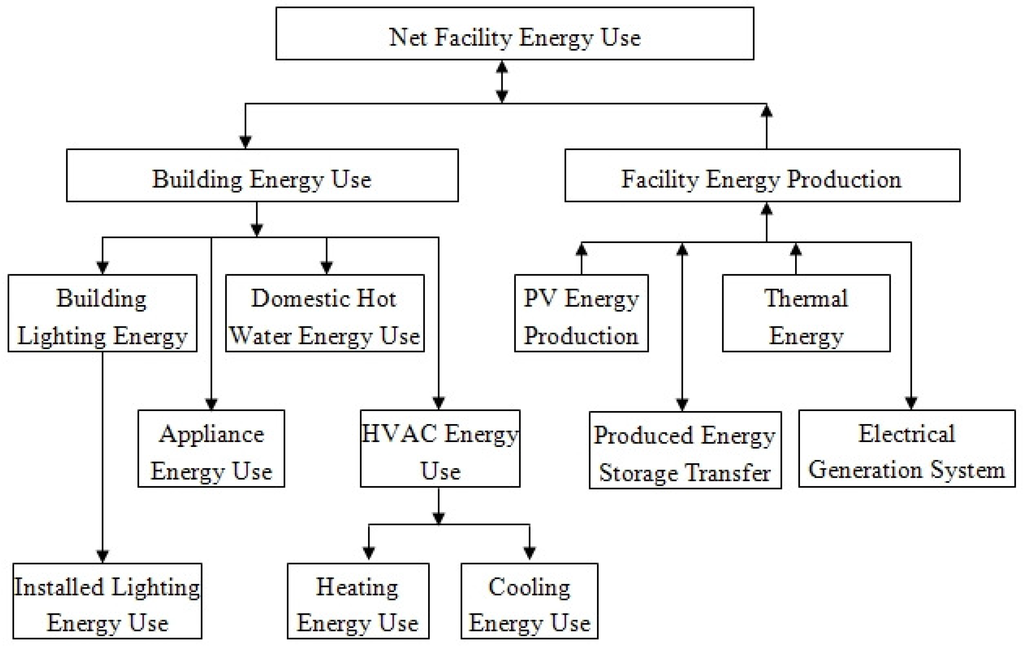 Figure 3 shows the relationship between all energy use metrics that were identified above. As shown, metrics are summed up to the Net Facility Energy Use metric. The directional arrows identify the direction of energy flow. For instance, the PV and Thermal Energy Production metrics supply energy to the home while the Electrical Generation System Losses has an arrow pointed toward the box and is a consumer of energy. As shown, all Facility Energy Production components are not considered as consumers in the Building Energy Use metric, their consumption is taken into account in the Facility Energy Production group. This diagram has been adapted from NREL’s “Procedure for Measuring and Reporting Commercial Building Energy Performance” [].