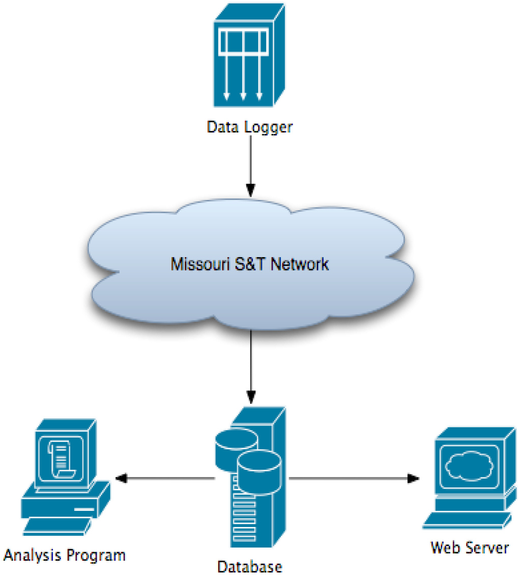 In modeling the entire building envelope and to measure the previously mentioned list of metrics a sensor and data logger network is installed in all three houses of the Solar Village. The sensors identified and used in this research are highly accurate and precise for scientific measurement. The sensors and system are also calibrated on-site to verify the validity of the data collected. The data logger is connected to the University network, which allows the data to be transferred and stored in a database. The web server displays the data from the database and any data can be exported to a program for analysis. The sensor system architecture is visually represented in figure 4 below.
