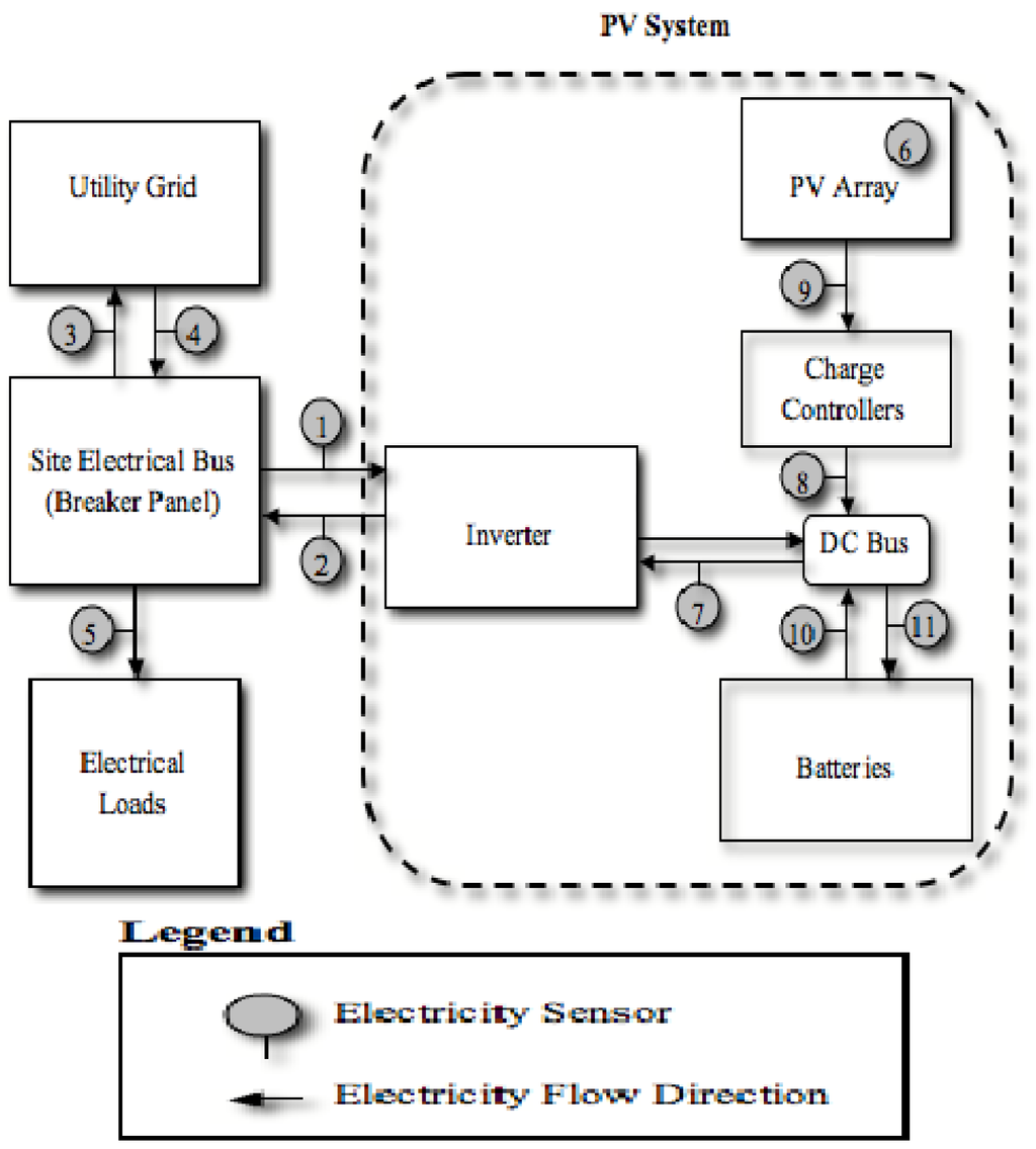 The metric of the data that is collected from each sensor is listed in Table 2. The NREL performance metrics are sensors 1 through 6 and the additional sensors that have been added for this project are 7 through 11. The photovoltaic system is considered to be the PV array and balance of systems components. The balance of system (BOS) components includes the inverter, batteries, and charge controllers.