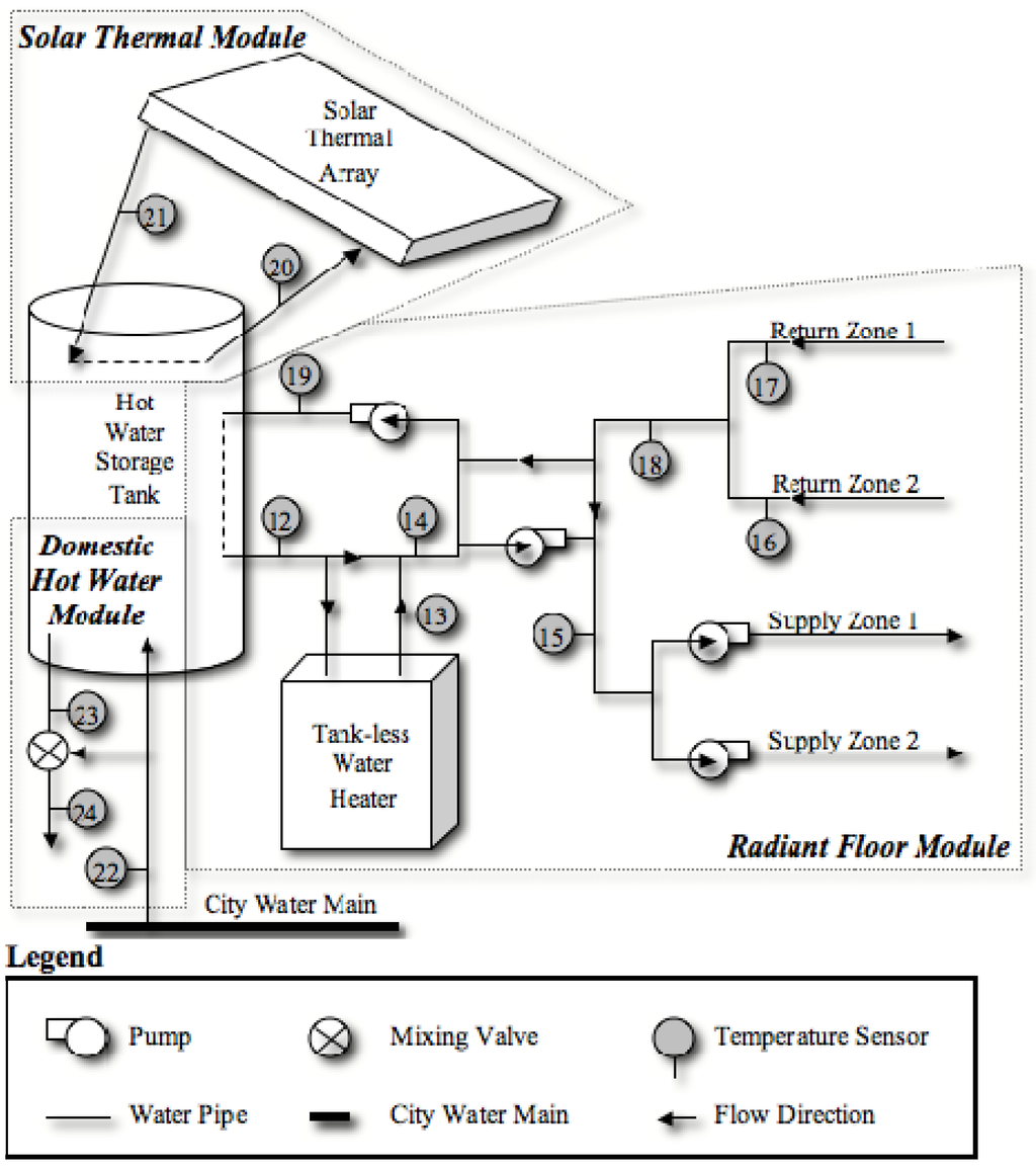 The hydronic pump board will contain fifteen temperature sensors to measure the energy in three sections of the system. Figure 7 is a schematic of the house hot water systems. The first section is the main boiler loop that collects heat from the hot water tank. This will be measured on each side of the storage tank (sensors 12 and 19) to determine the amount of energy that is taken out of the tank and the efficiency with which it is extracted. The second section is the back up tank-less water heater that is used if the storage tank is not hot enough to meet the house demand. Sensors also measure before and after the component (12 and 13) to determine the energy that is added to the system and to compare with the electrical energy used to introduce that thermal energy to the water. The injection loop adds hot water from the boiler loop into the circulating zone loops. The amount of energy being added to the zone loops will be measured (14, 15, and 18) and finally the individual zone loops will be measured (15, 16, and 17) to determine the amount of energy that is within each zone loop. This information will be used to calculate metrics and determine inefficiencies in the system. Table 3 lists the sensors and corresponding metrics.