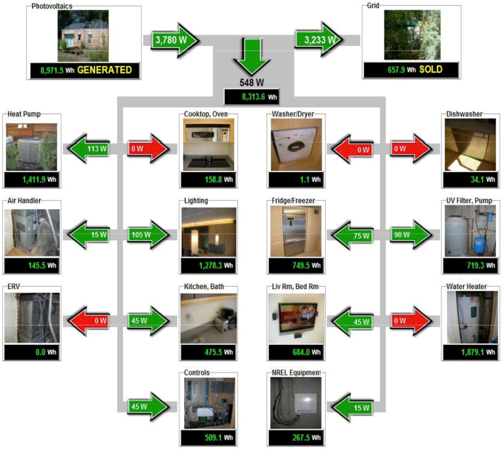 The data in the database is displayed in an intuitive web interface for the house tenants to view and understand. The electrical energy display, for example, is a basic line diagram of the house circuits. It displays the PV Energy Production, Net Facility Energy Use, and individual appliance usage with instantaneous power draw and daily totals. The display must be intuitive and easy to understand for the general user to gain the most advantage from the feedback interface. For this reason the display uses arrows and colors to identify the quantity and direction of power flow. Figure 8 is a snapshot of the web interface. The webpage automatically updates every minute allowing for pseudo real time information. The user can pull up the webpage at anytime and adjust actual energy usage by turning off appliances or systems to stay within the energy production of the PV and in many cases essentially operate a net zero energy home.