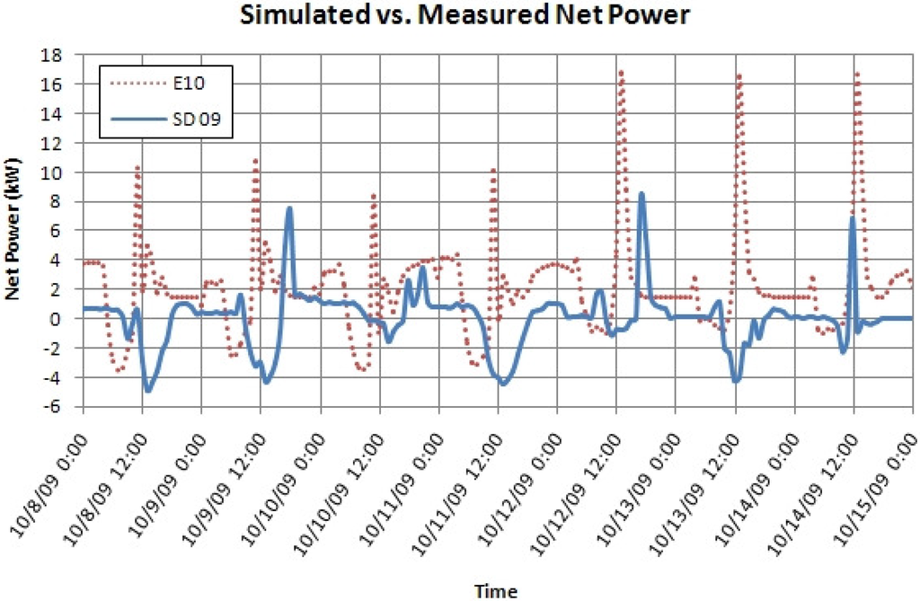 The graph produced from the 2009 Solar Decathlon competition that was used in this comparison can be seen plotted with the Energy-10 graph in Figure 3. In this graph, a positive value indicates PV production, and a negative value indicates building energy consumption. Energy-10 creates many different graphs after a building is simulated. The only graph which allowed a direct comparison to the competition graphs was the hourly Building Electric graph. This is plotted in Figure 3 with the competition graph. It should be noted the Solar Decathlon graph had data points every 15 min while the Energy-10 graph took data points every hour, so the Solar Decathlon data was reduced by using only the data collected on the hour.