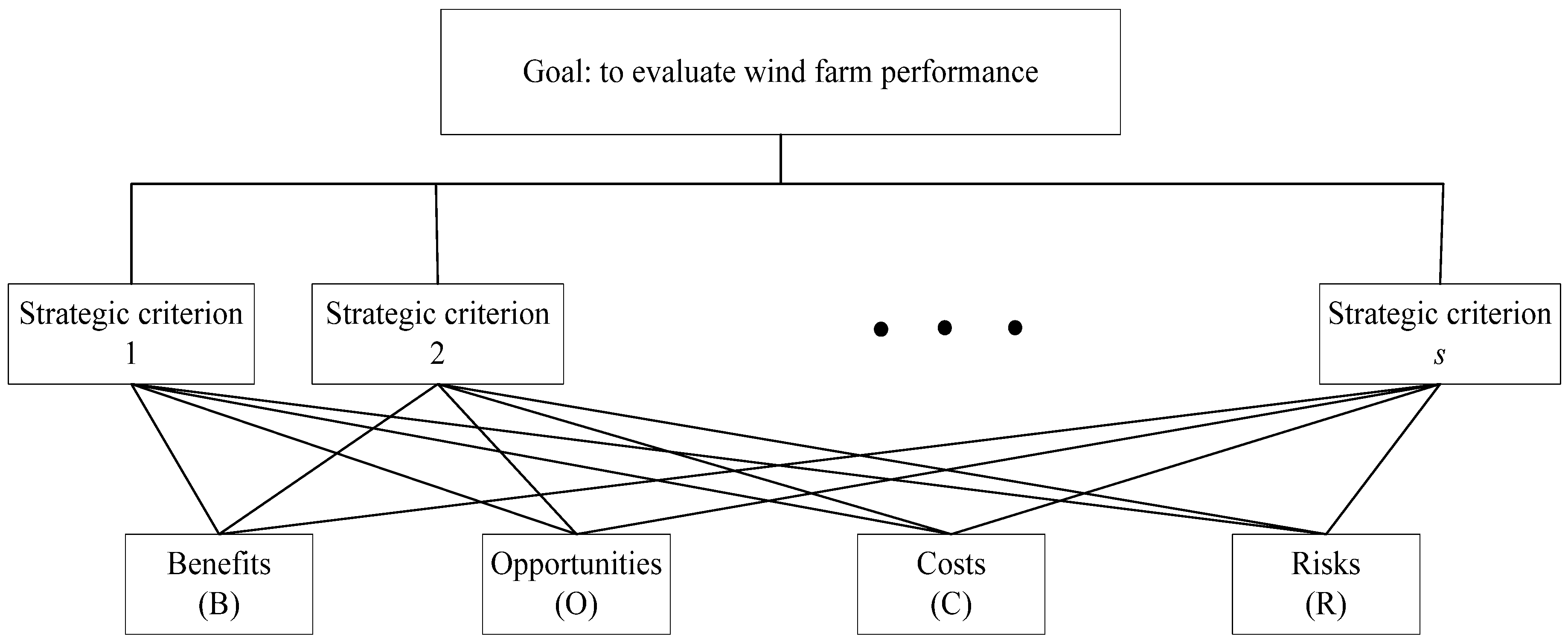 - Step 2. Construct a control network for the problem. A control network, as depicted in Figure 2, contains strategic criteria and four merits, benefits (B), opportunities (O), costs (C) and risks (R).