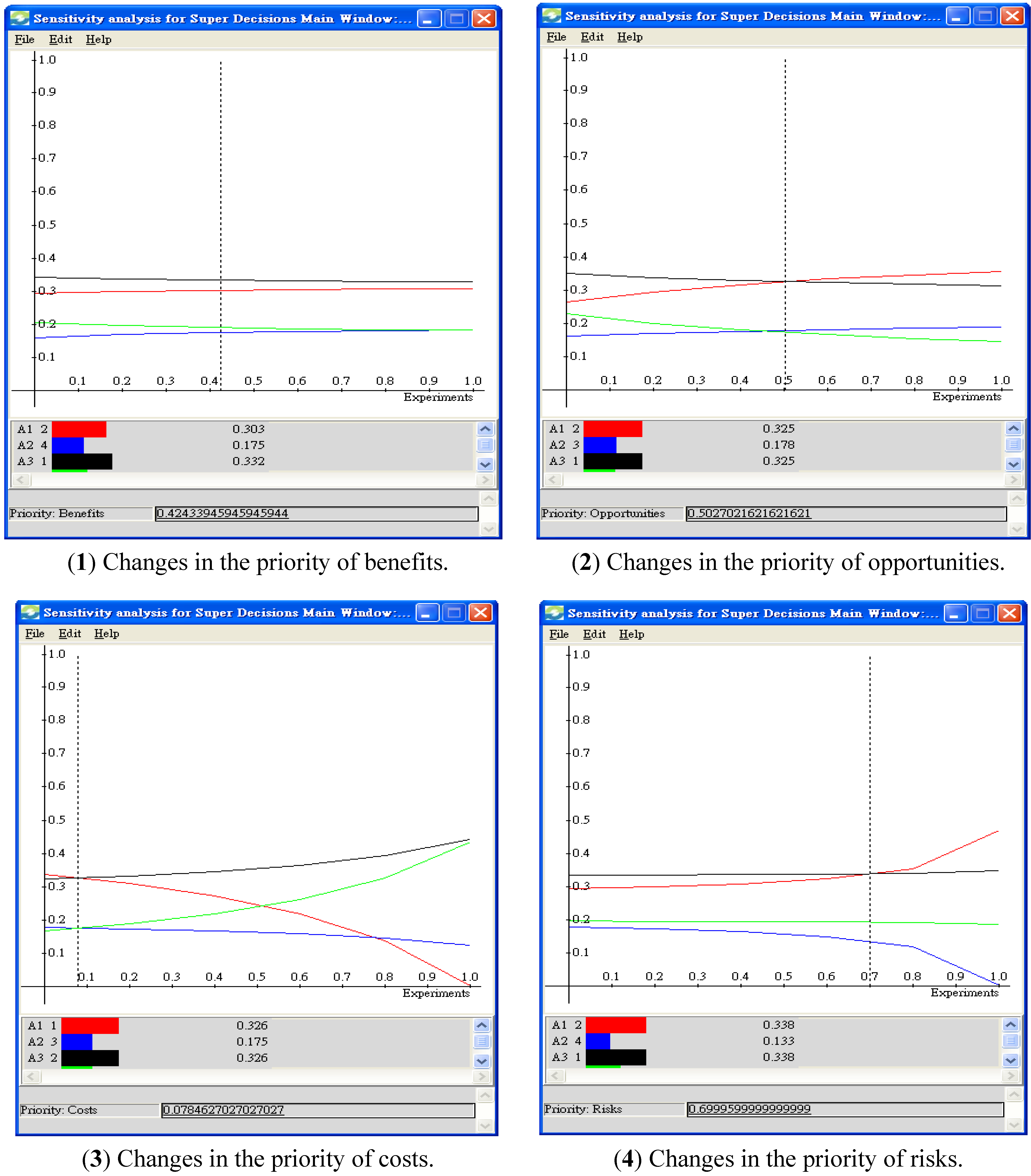 - Step 7. Determine the priorities of the merits. Calculate the priority of a merit by multiplying the importance of the merit on each strategic criterion from Step 6 with the priority of the respective strategic criterion from Step 4 and summing up the calculated values for the merit. Normalize the calculated values of the four merits, and obtain the priorities of benefits, opportunities, costs and risks, that is, b, o, c and r, respectively.