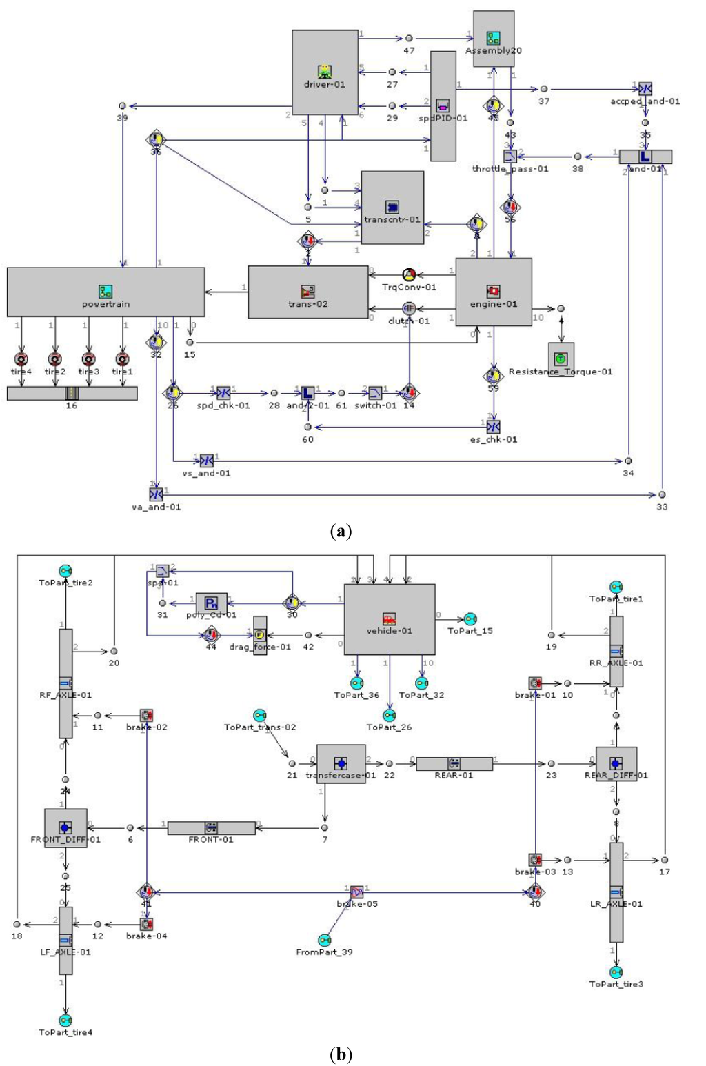 GT-Drive model of the conventional LMTV truck. (a) Powertrain model; (b) Vehicle model.