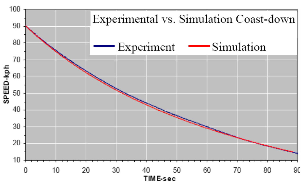 Road Load Correlation The accuracy of simulated fuel economy is mainly affected by road load calculation. If the calculated road load is different from the experiment, it leads to inaccuracy in the fuel economy calculations because the required engine torque to propel the vehicle through the driving cycle would be higher or lower than actual required. Coast-down tests were performed to validate the road load. The comparison of coast-down time from vehicle speed 90 kph to 20 kph is shown in Table 2. The error between the simulated and experimental data can vary based on the corresponding experimental data set chosen. The experimental variation was due primarily to the difference in side and head winds present during each experimental run. The coast-down simulation assumes ideal environmental conditions which do not exist in the experimental tests. The test with the best environmental conditions is shown in Figure 5. This test had the smallest amount of overall error with only 3% of the points outside the Β±5Β° yaw angle range and 17% outside the relative wind speed range of Β±5 kph. After examining the experiments data, the average of the filtered coefficients from experiments determined the rolling resistance coefficients in Equation (3): Ξ±r = 819.135 N, Ξ²r = 18.3576 N/kph, Ξ³r = 0.30751 N/kph2. These values were used in the simulation of FTP-72 drive cycle.