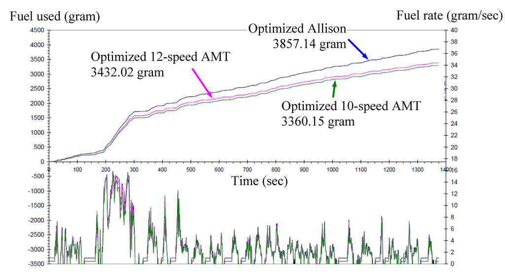 Additional fuel economy comparison was two AMTs. To ensure a fair comparison, the optimized shift schedule of the Allison was used for comparison with the two AMTs. Compared with the optimized Allison shift schedule, the 10-speed AMT showed a 14.5% improvement and the 12-speed AMT showed a 12.2% improvement in fuel economy. This translated to 0.9 mi/gal improvement with the 10-speed AMT and 0.76 mi/gal improvement with the 12-speed AMT over the FTP-72 drive cycle. Figure 8 presents the comparisons of fuel consumption of optimized shift schedule of the Allison and two AMTs.