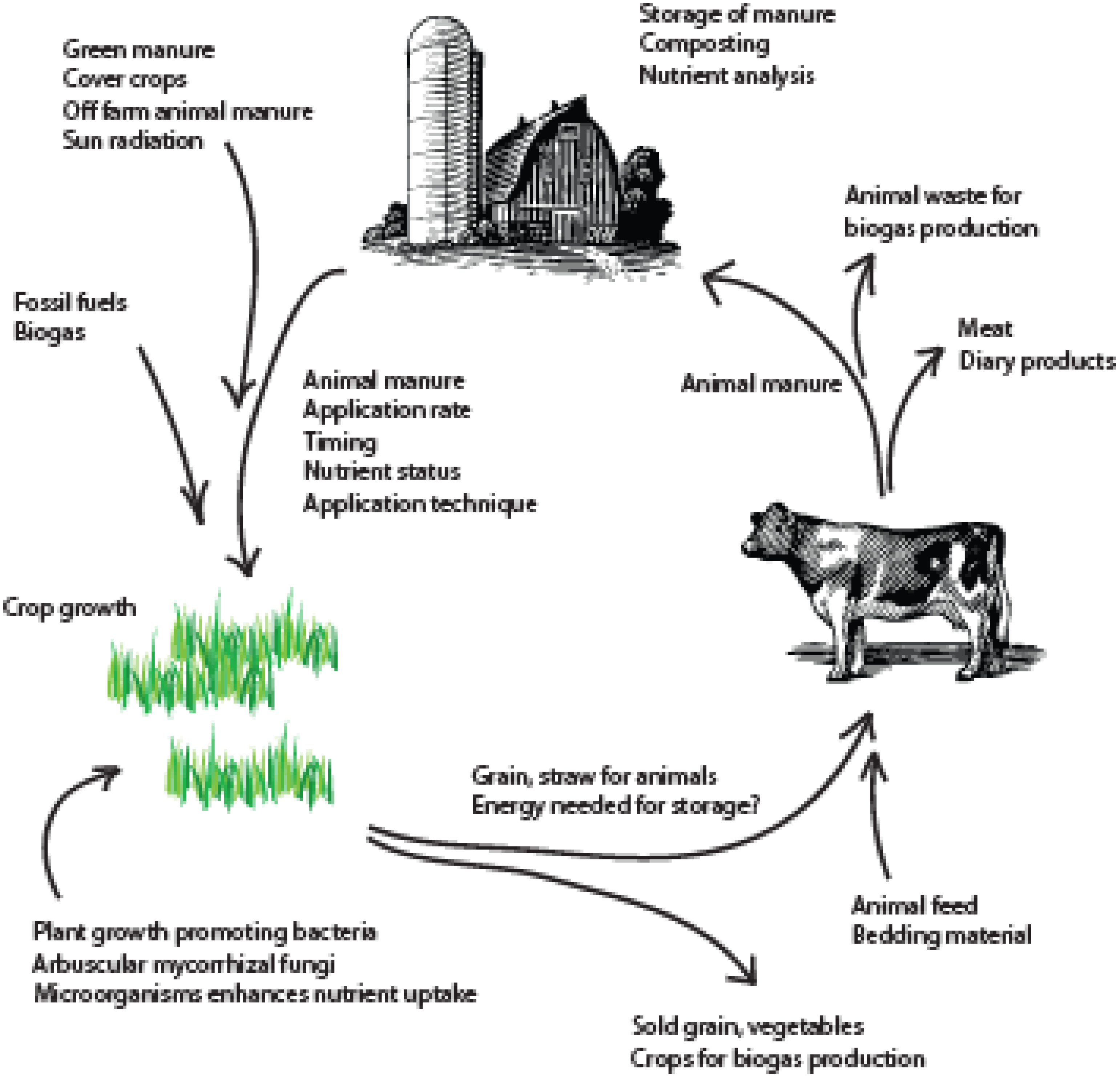 Energy and nutrient re-cycling in organic farming. Animal feed and bedding material are needed in order to keep animals. The farmyard manure can then be stored, preferably composted to reduce the number of pathogenic bacteria, or used for biogas production. Nutrient analysis is an important step if the manure is to be used as a fertilizer. Other types of fertilizers that can be used are cover crops and green manure. If the farm does not keep animals, or cannot produce enough manure, off-farm manure is sometimes bought from near-by farms. The application technique as well as the timing and rate of application, are very important steps to consider to minimize nutrient leaching. Fuels used for the farming equipment is often of fossil origin, but could in the future consist of biogas, in order to minimize farm dependence on fossil fuels. Plant growth promoting bacteria and arbuscular mycorrhizal fungi can be used in crop production to enhance plant nutrient uptake and to minimize nutrient leaching. The crops produced may then be stored and sold to consumers or used as feed for the farmyard animals, thus closing the farm energy cycle.