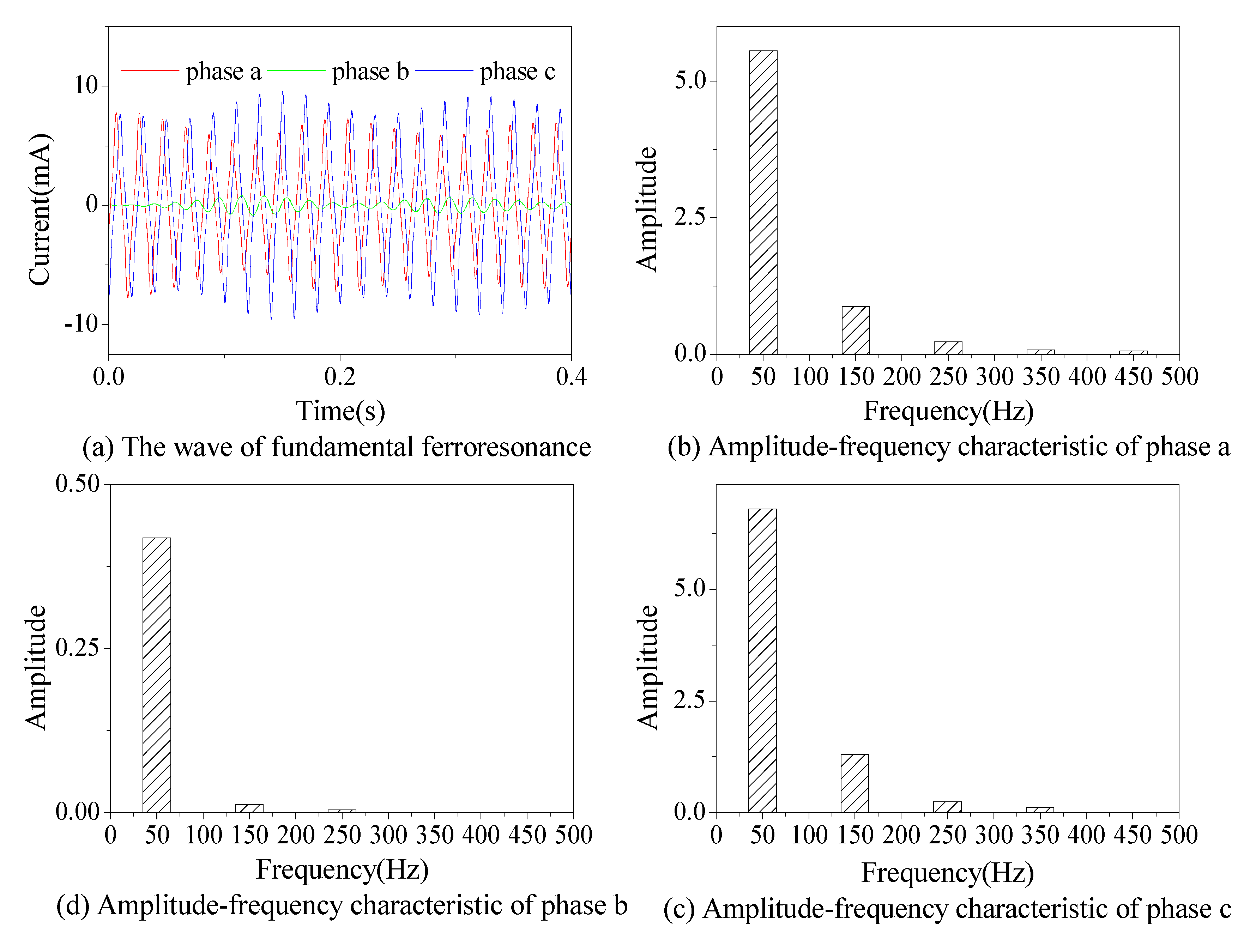 When ferroresonance occurs in isolated neutral networks, the currents in three phases are composed by the currents through PT’s nonlinear inductance, system-to-ground capacitances and loads.
