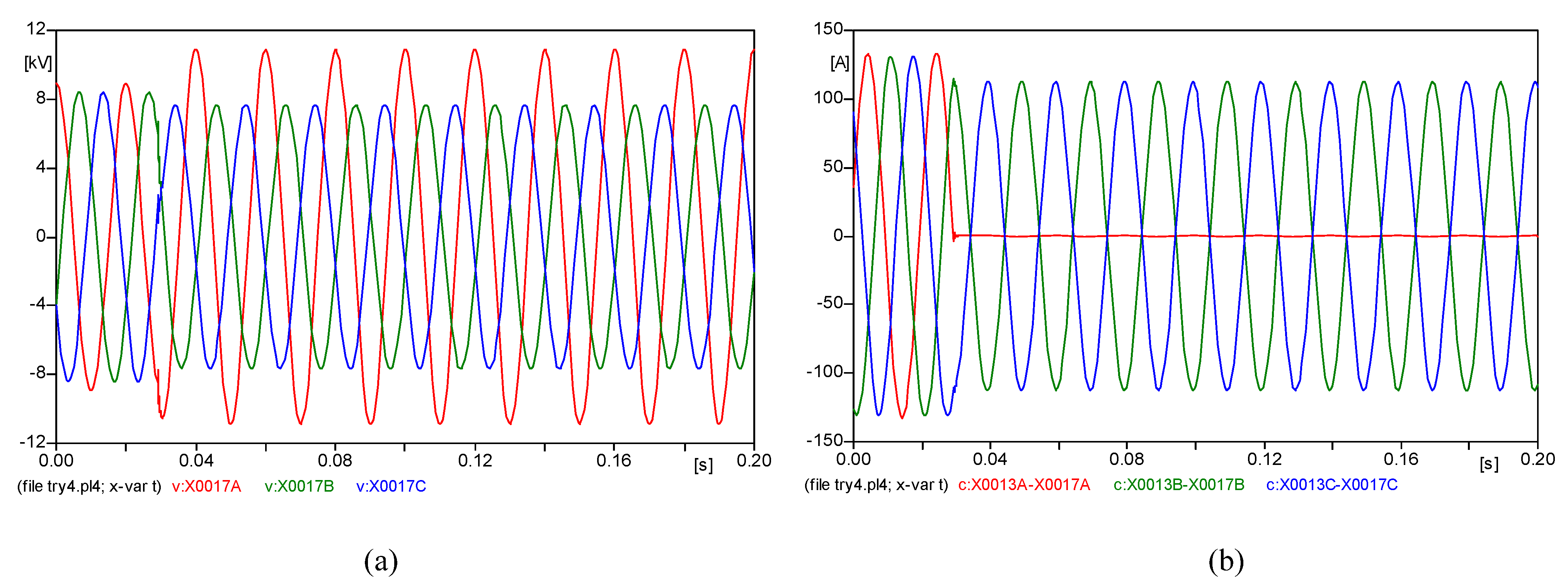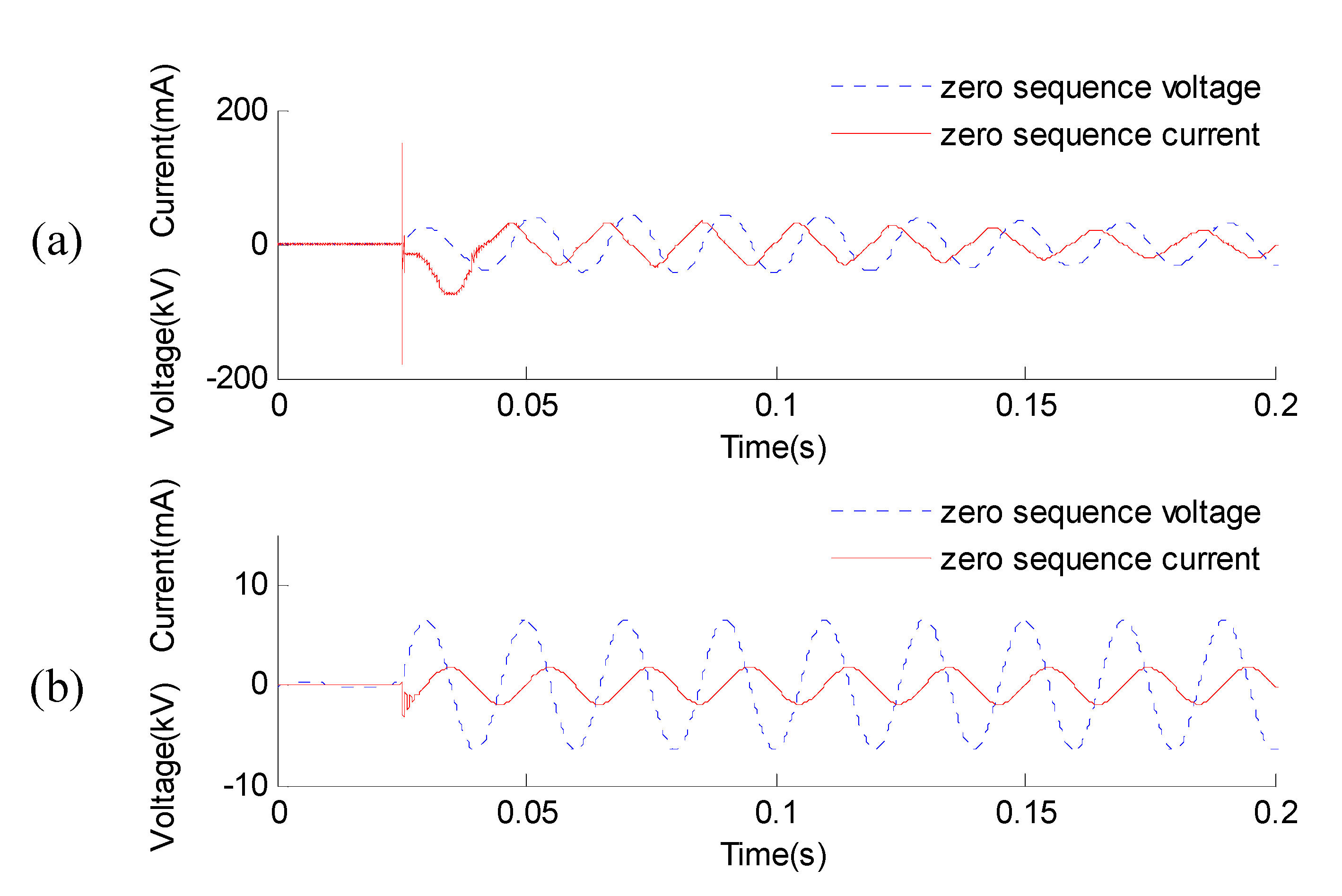 (a) Zero sequence voltage and current of fundamental ferroresonance; (b) Zero sequence voltage and current of single phase-to-ground.