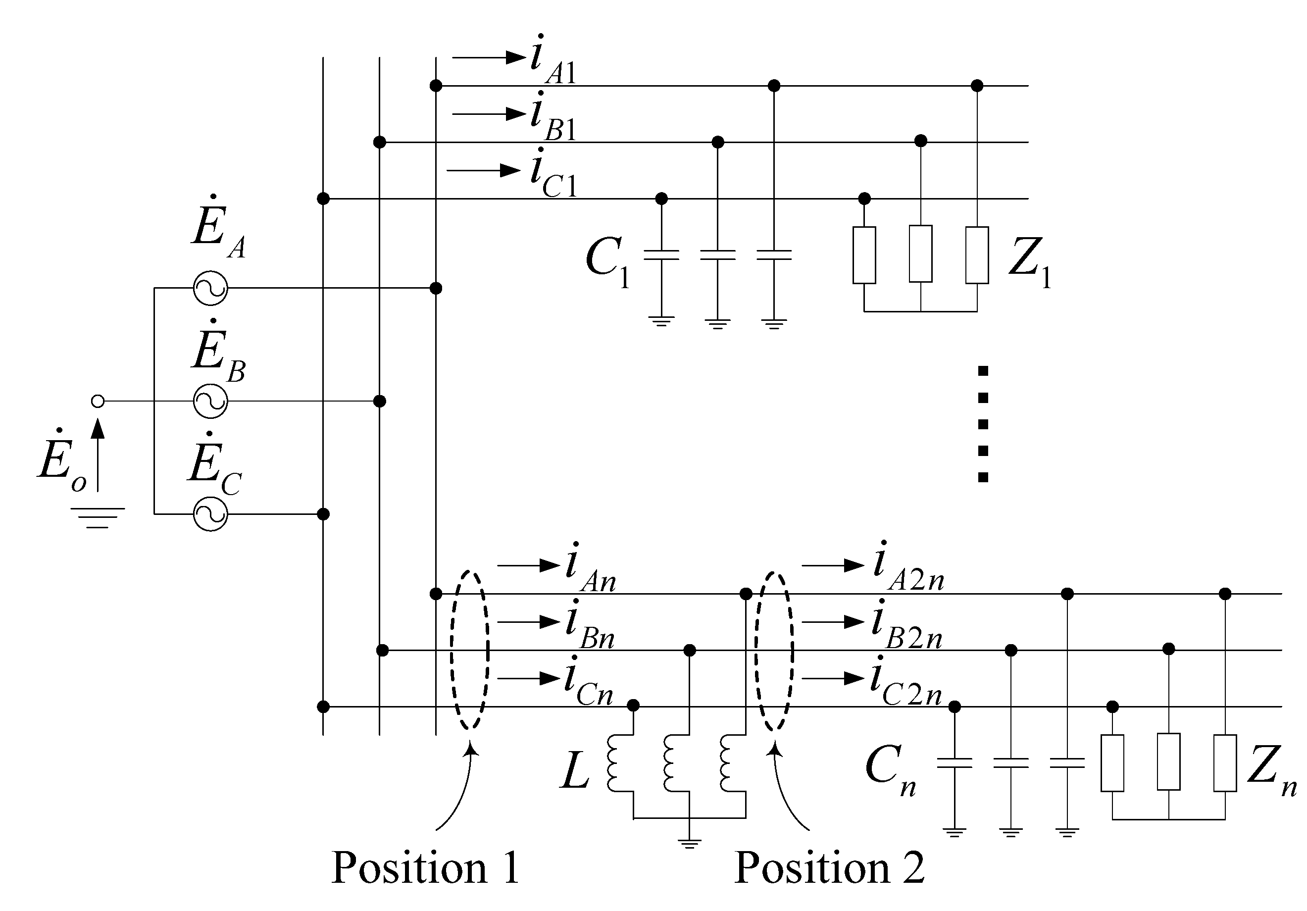 nth feeder, the other feeders are non-fault feeders. The zero sequence current of fault leader can be described as Equation (27) too. The zero sequence current of the fault feeder still falls behind the zero sequence voltage by 90 degrees, but if the zero sequence CT is installed between the PT and the over head line (Position 2 in