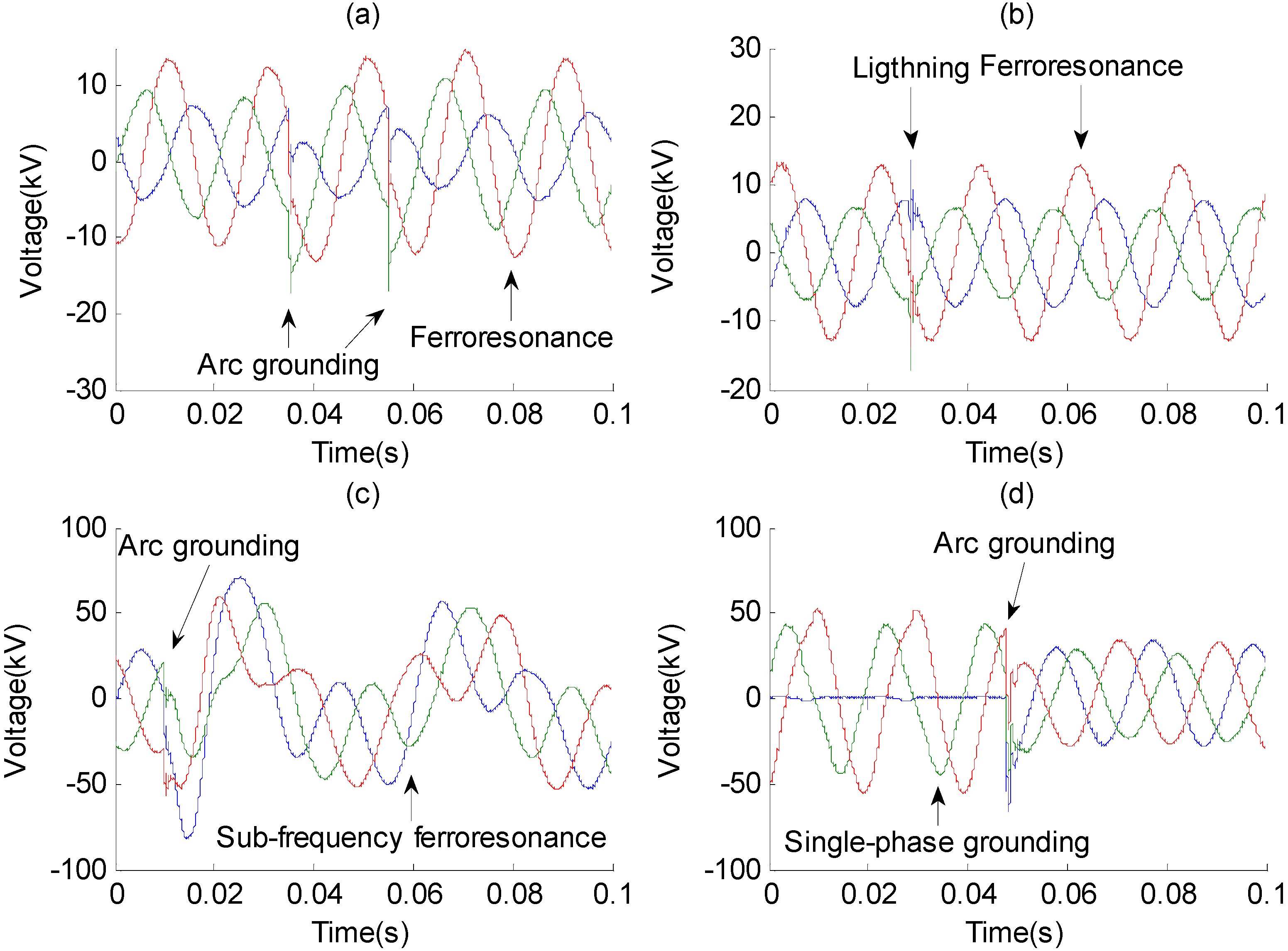 Four typical mixed over-voltages: (a) Ferroresonance mixed with arc grounding; (b) Ferroresonance mixed with lightning; (c) Sub-frequency ferroresonance mixed with arc grounding; (d) Single-phase grounding mixed with arc grounding.