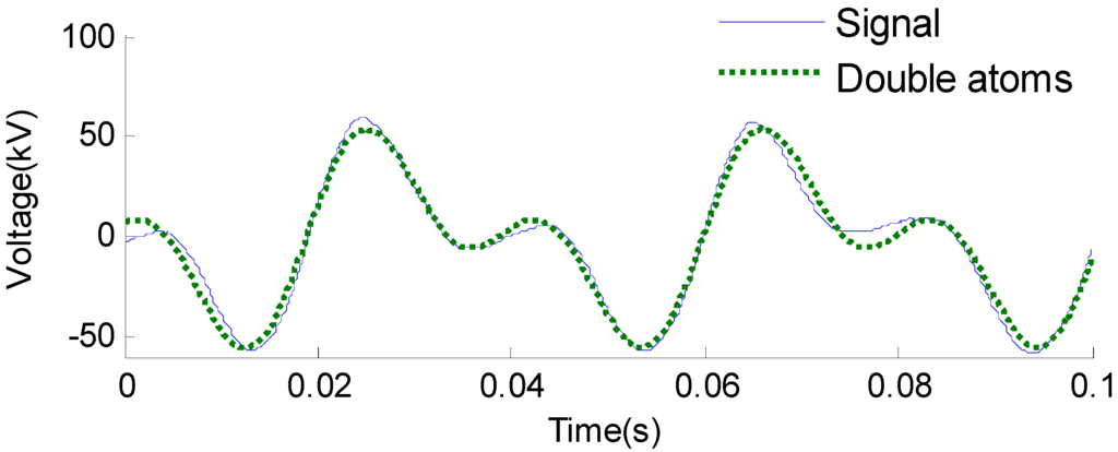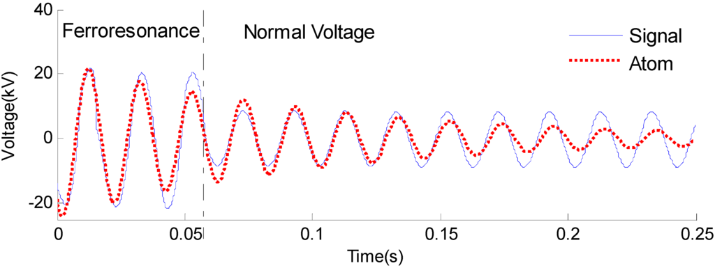 In the actual decomposition, some incorrect decompositions could occur. For example, the signal shown in Figure 2 is a mixed over-voltage. In this signal, a ferroresonance exists until 0.05 s, after that the ferroresonance disappears and the voltage recovers to the normal situation. As for this signal, the correct decomposition result should be a pure sinusoidal wave which has a larger amplitude within 0~0.05 s and the pure sinusoidal wave which has a normal amplitude value within 0.05~0.25. However, when using MP to decompose the signal, the best approximant atom depends on the inner product between the atom and signal overall time domain. The bigger the inner product, the better the atom is. Based on this judgment, a damped sinusoid covering the overall time domain is obtained, but the original signal’s true internal physical phenomena are not reflected, which is shown in Figure 2. Aiming at this incorrect decomposition, some solutions have been proposed.
