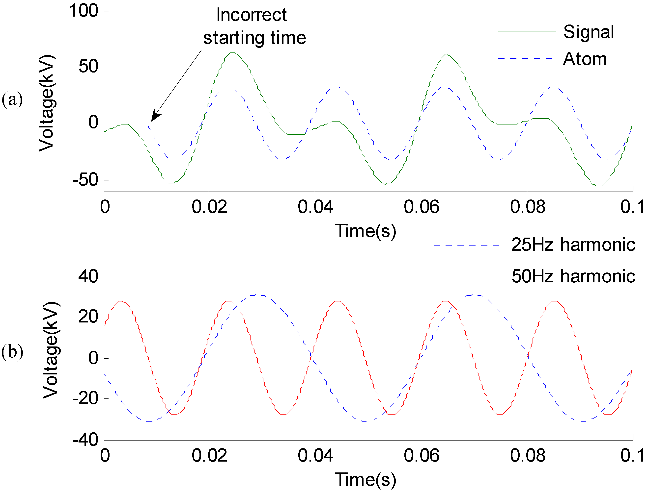 An incorrect decomposition is shown in Figure 5a. The target signal to be decomposed in the figure is a sub-frequency ferroresonance over-voltage. The result obtained by the MP algorithm is a sinusoid atom with incorrect starting time, while the correct decomposed result should be a pure sinusoid waveform with its starting time at 0 s. The main reason causing this incorrect decomposition is that the two main harmonic components (50 Hz and 25 Hz) of the sub-frequency ferroresonance have similar amplitude at the beginning, and the difference of the phase is close to 1 π, as shown in Figure 5b. The amplitudes of these two components (50 Hz and 25 Hz) are offset each other at the beginning, which may mislead the MP algorithm in searching the correct starting time tsp.