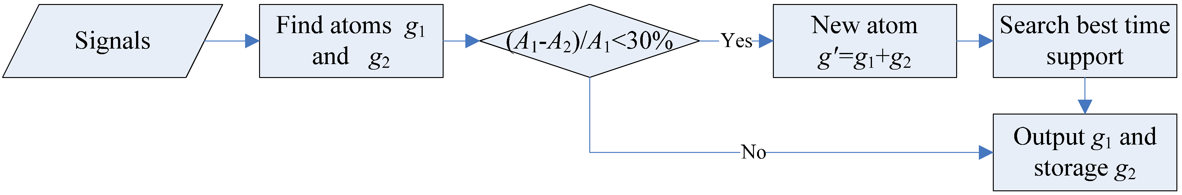 The double-atom decomposition method may unavoidably cause a rapid increase of the computational complexity. The calculation time is so long that the algorithm may lose its actual application value even if the algorithm is optimized by PSO and FFT. In order to reduce the computational complexity, the algorithm of double-atom is modified as follows and shown in Figure 6: