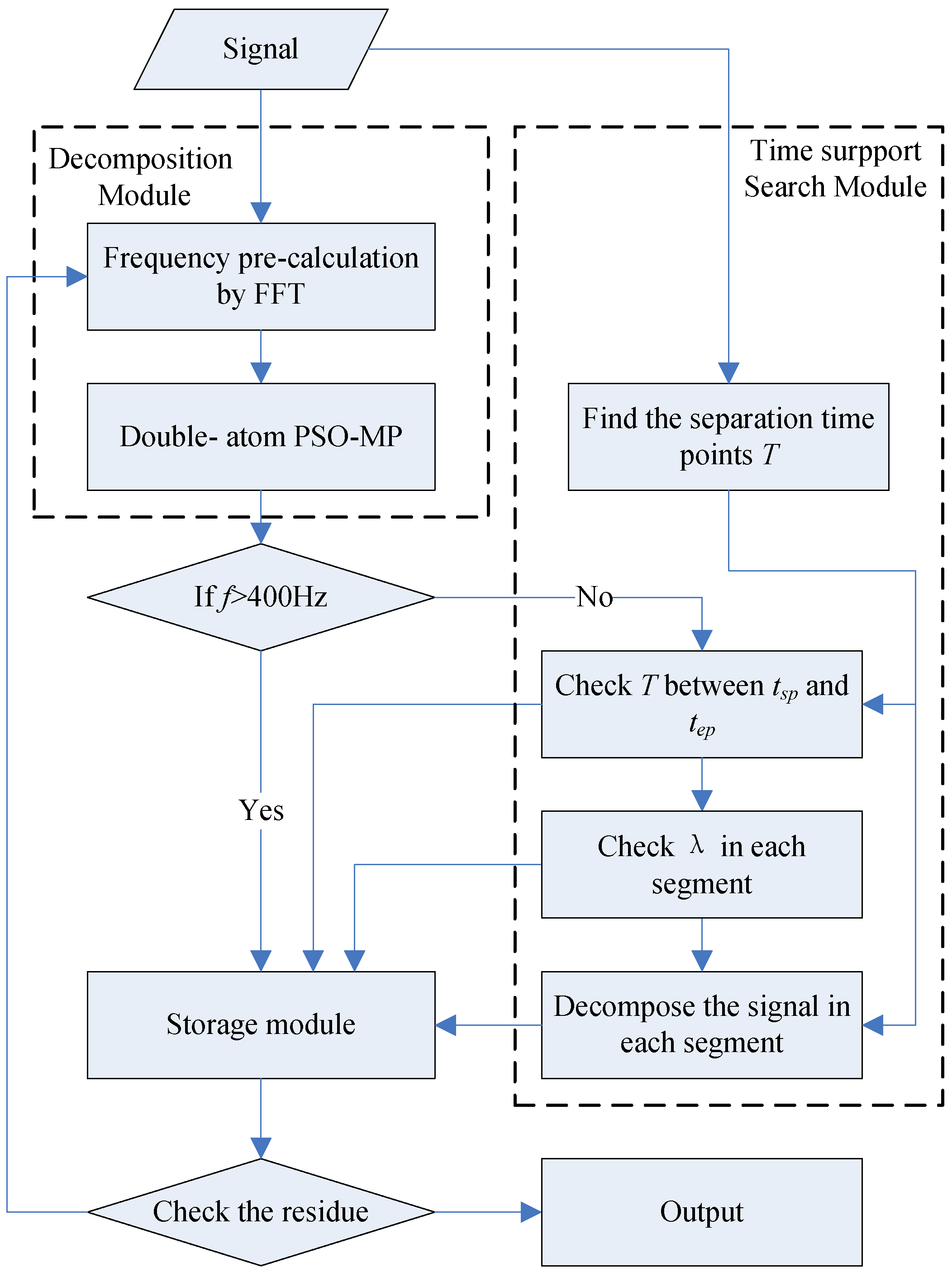 - Decompose the signal thought double-atom PSO-MP in each segment, then search the best time support of these atoms (see Section 4.3). Output the result to the storage module.