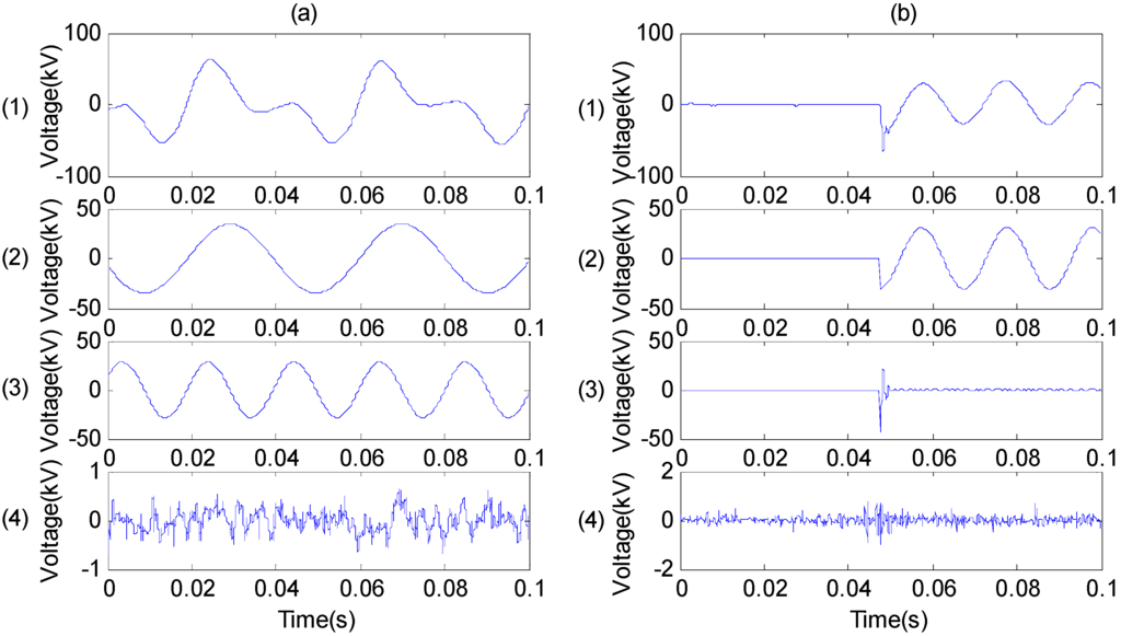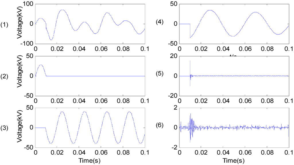 Figure 10 shows the original waveform of over-voltage, four decomposition results, and the residual from index (1) to (6). The original signal is a sub-frequency ferroresonance caused by an arc grounding which occurs at 0.01 s. The first decomposition result is the normal signal of 0~0.01 s; the second and third decomposition results are 50 Hz and 25 Hz harmonic of the sub-frequency ferroresonance after 0.01 s, and the fourth decomposition result is the arc grounding transient oscillation waveform at 0.01 s.