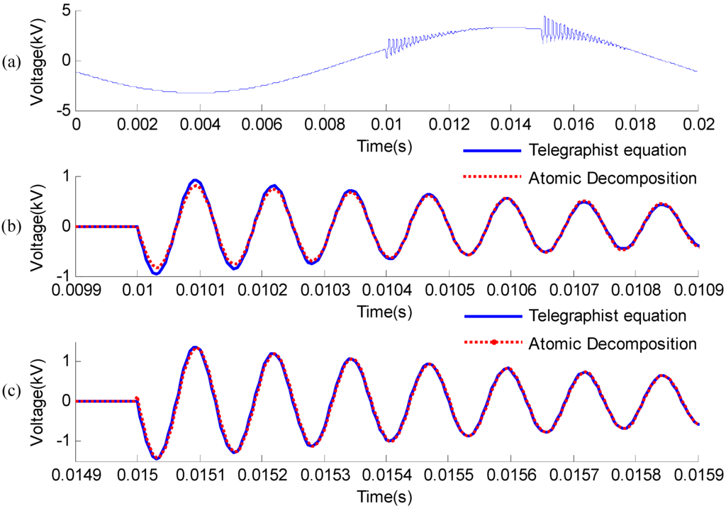The contrast between the Telegraphist equation and Atomic Decomposition. (a) The waveform of a high frequency oscillation and its reflection; (b) The contrast between Telegraphist equation and Atomic Decomposition of original high frequency oscillation; (c) The contrast between Telegraphist equation and Atomic Decomposition of the reflection of high frequency oscillation.