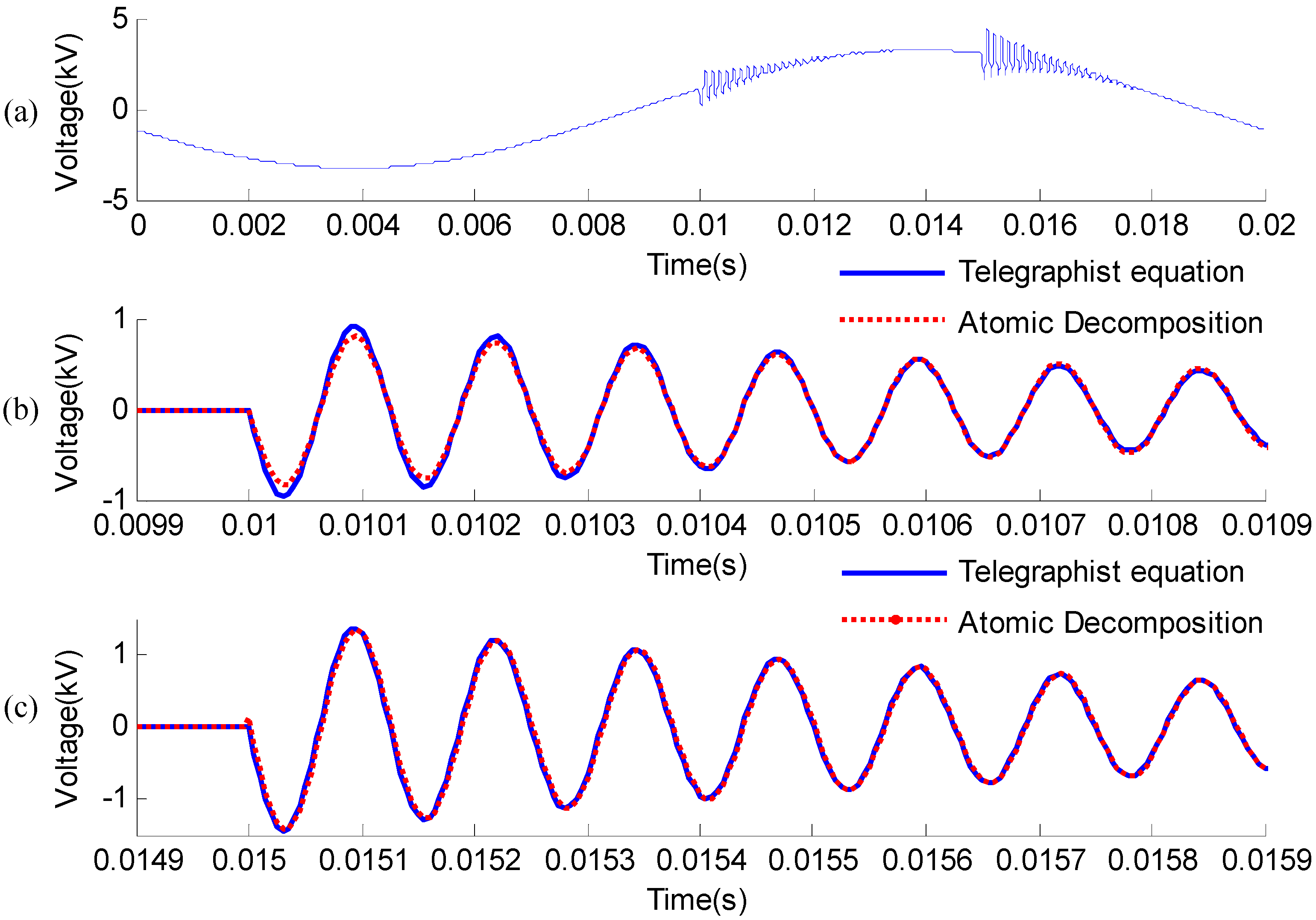 The voltage source is the combination of a power frequency voltage source and a high frequency oscillation voltage source, and the expression of the voltage is shown in Equation (12). The voltage wave will travel through a resistor and a wave impendence with a length of 500 km. The end of the wave impendence is connected with a zero load. The V(t) of the point between the resistor and the wave impendence can be obtained, which is shown in Figure 12a. Because there is a reflection at the end of the wave impendence, Figure 12a show s an original signal that contains a high frequency oscillation (at 0.01 s) and its reflection (at 0.015 s). Figure 12b,c are these two high frequency oscillations obtained from Telegraphist equation and Atomic Decomposition. It is clear that the decomposition results obtained from Atomic Decomposition are highly similar to the results obtained from the Telegraphist equation. It is thus verified that the decomposition algorithm has a high value in practice.